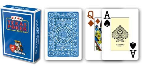 Kvalitní pokerové karty oblíbené značky Modiano. Karty mají klasický širokoúhlý formát. Karty jsou dvourohé - tedy v protilehlých rozích je uvedena hodnota karty. Modiano karty jsou velice oblíbené u pravidelných hráčů pro svou vysokou životnost a odolnost. Díky složení ze 100% plastu vydrží tyto karty 100 krát více her než karty papírové nebo pouze s plastovým potahem. Karty jsou omyvatelné, vodotěsné a pyšní se svou dlouhou životností.
