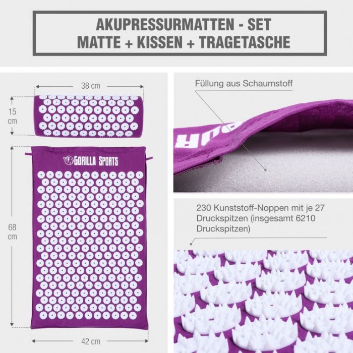 Akupresurní podložka je masážní podložka, která vychází ze staré čínské tradice a může pomoci uvolnit blokády a snížit bolest. Hroty, které mají stejný účinek jako fakírovo prkno, podporují krevní oběh. Tato podložka v různých barvách je ideální pro každého, kdo chce jednoduše relaxovat. Po stresujícím dni v práci nebo náročném tréninku zajistí tvrdé plastové hroty silný krevní oběh a s ním spojené uvolnění, zejména zádových a krčních svalů.