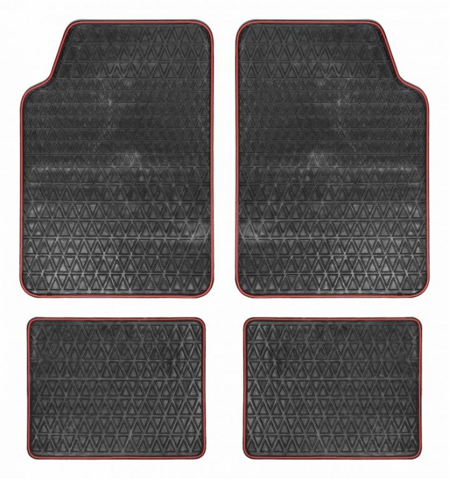 Univerzální gumové koberce do automobilu, s protiskluzovou úpravou. Sada 4 kusů se skládá ze 2 předních koberců a 2 zadních koberců. Berevné provedení je černé s červenou linkou. Koberec je opatřen protiskluzovou úpravou na spodní části. Díky materiálu je snadná údržba.