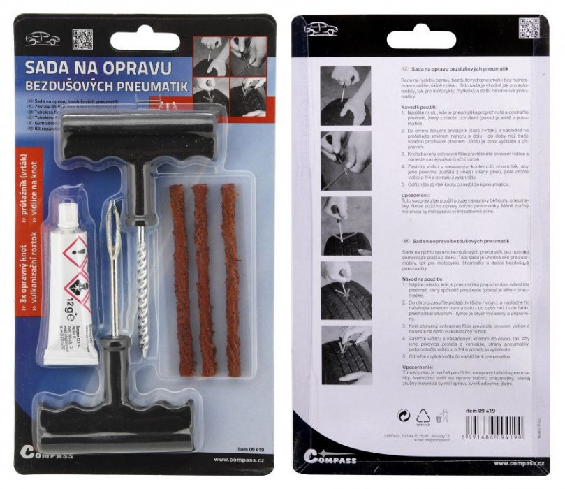 Tato sada je vhodná jak pro automobily, tak pro motocykly, čtyřkolky a další bezdušové pneumatiky.