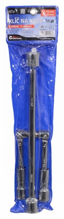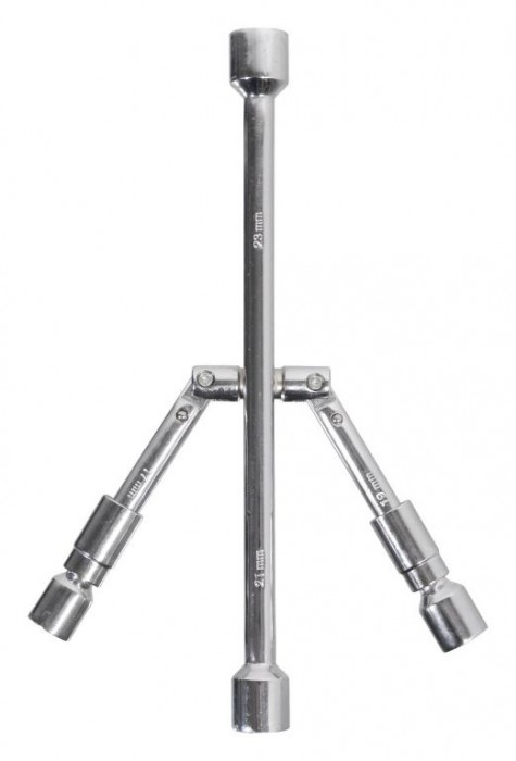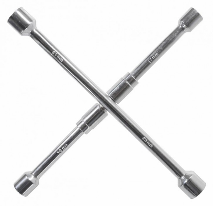 Celokovový skládací klíč ve tvaru kříže, který je určen pro povolování či utahování matic kol automobilů. Na jednotlivých stranách je osazen nástavci pro utahování a povolování matic či šroubů kol.