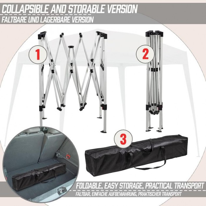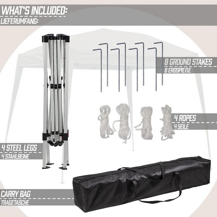 Uspořádejte zahradní párty či posezení s přáteli ve stínu tohoto stylového stanu. Klasický design a neutrální barvy dokonale zapadnou do jakéhokoli prostředí a podtrhnou estetiku Vašeho domova a zahrady. Dobře navržený robustní ocelový rám a skládací design nabízí vysokou úroveň funkčnosti, odolnosti a stability. Párty stan je dodáván se čtyřmi nohami, čtyřmi lany a osmi zemními kolíky (pro bezpečné postavení) a také taškou pro snadnou přepravu a praktické skladování.