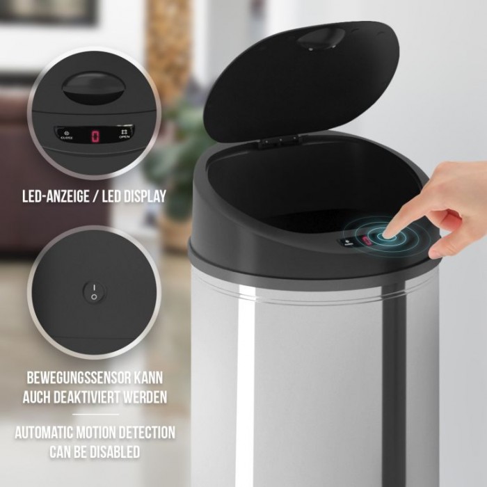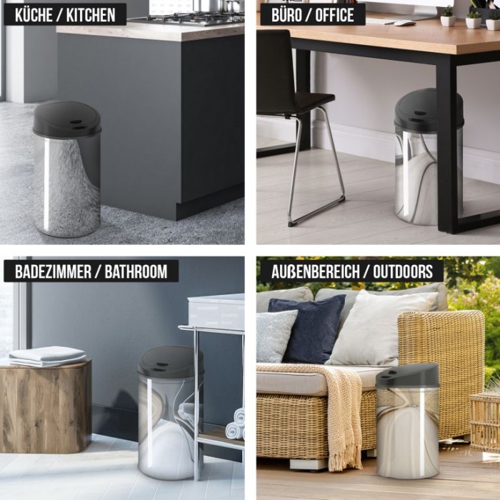 Zažijte nový standard čistoty s bezdotykovým košem, který se otevírá pohybem ruky. Elegantní stříbrný design se hodí do každé kuchyně i koupelny a usnadní každodenní úklid. Už žádné špinavé víko – vše je čisté a jednoduché.