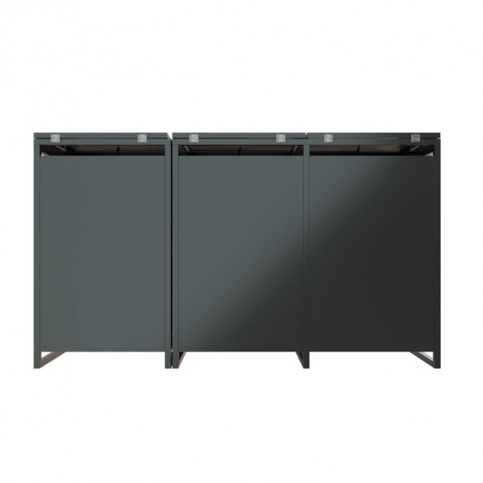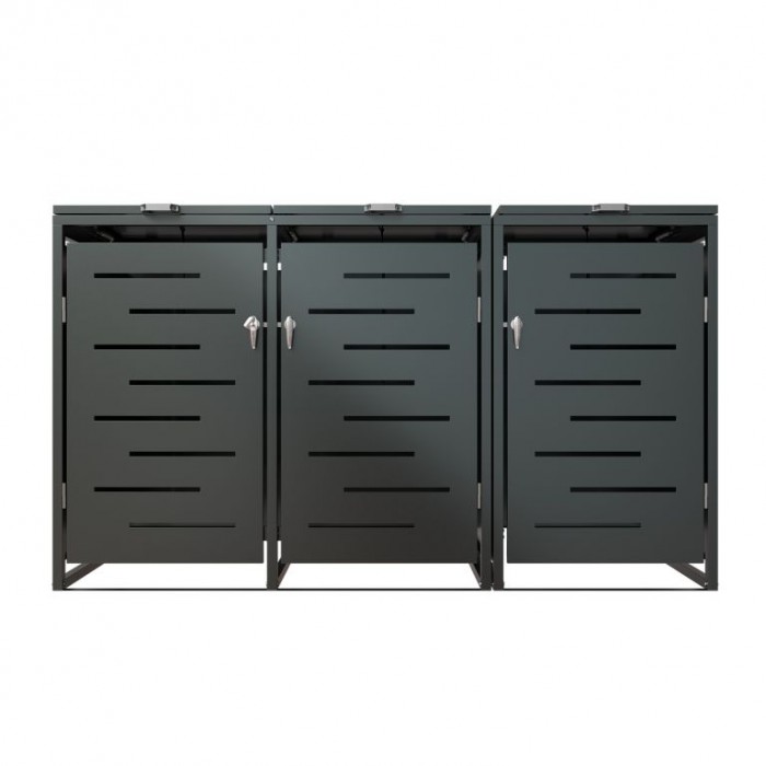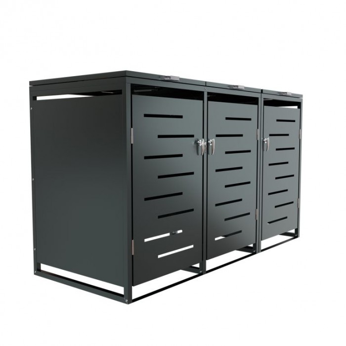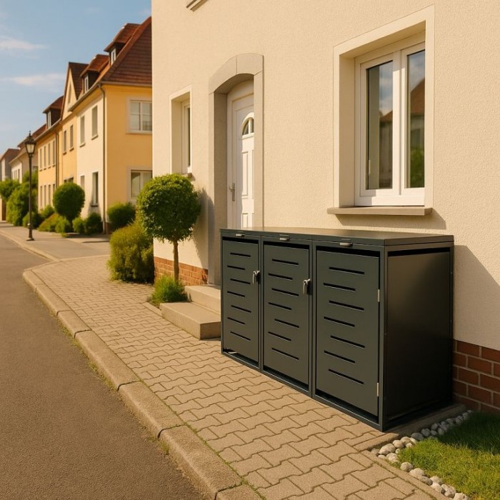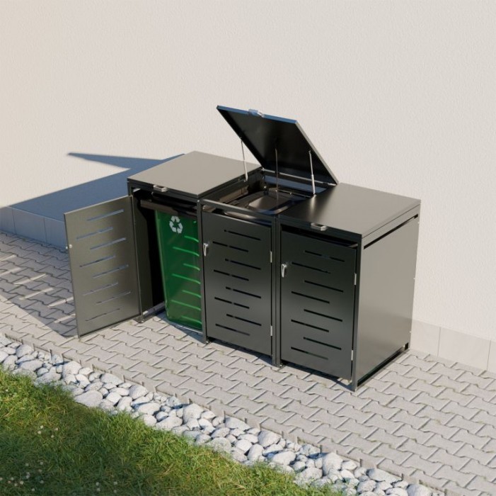 Nepřehledné a neestetické popelnice před domem? S tím je konec. Tento kovový přístřešek na tři nádoby promění prostor u vchodu nebo v zahradě v upravené a čisté místo. V elegantní antracitové barvě a s větracími otvory působí nenápadně, přesto moderně a funkčně zakryje obsah, který má zůstat skrytý.
