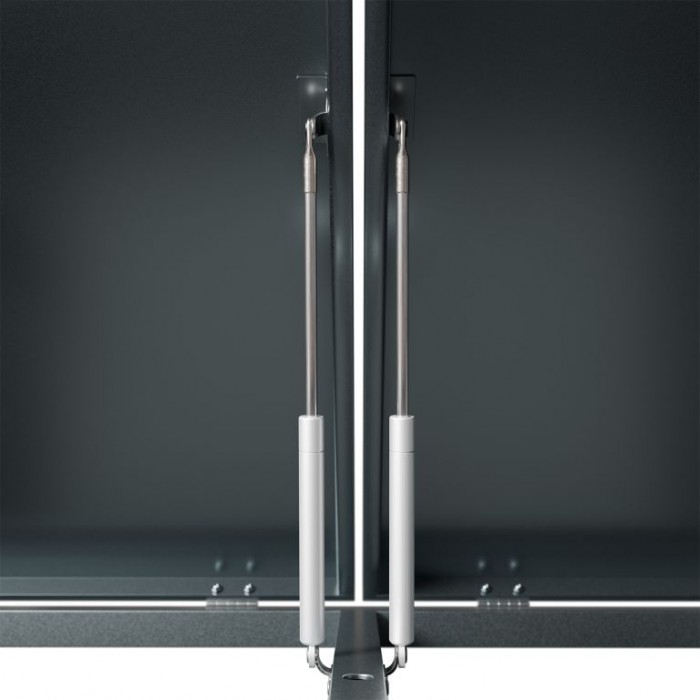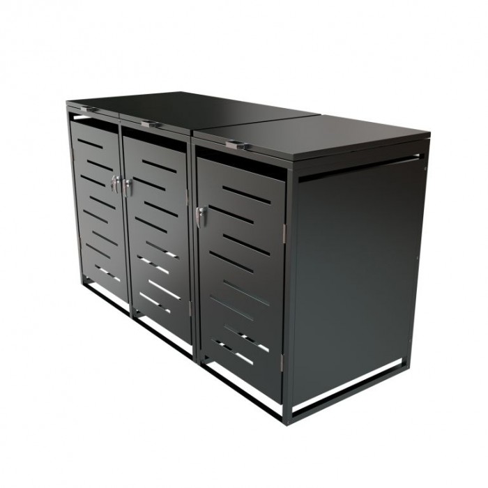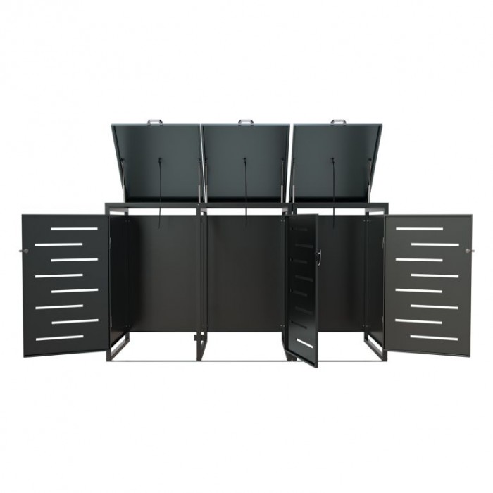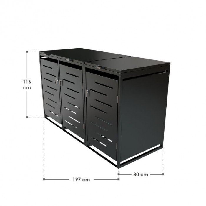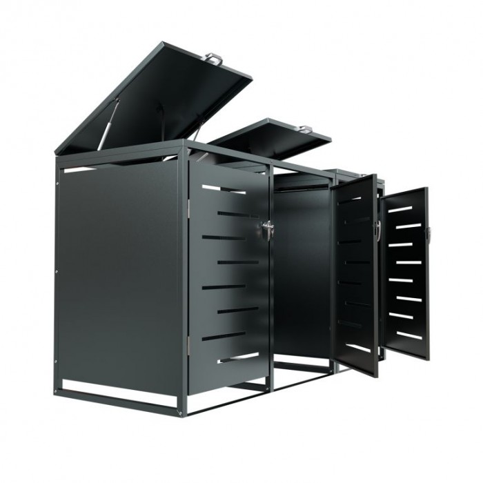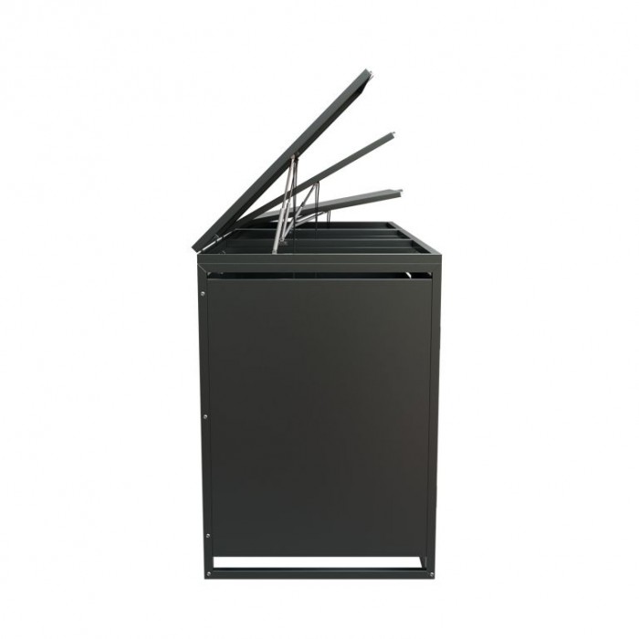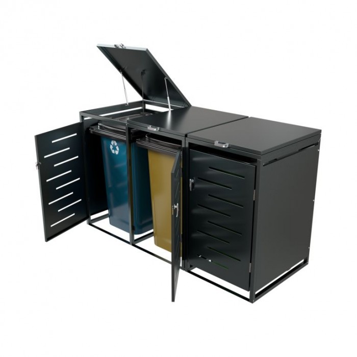 Konstrukce z pevné pozinkované oceli odolává dešti, sněhu i UV záření, a navíc se snadno čistí. Horní víko s plynovou vzpěrou zaručuje pohodlné otevírání bez námahy, zatímco přední zamykatelné dveře chrání popelnice před nechtěným přístupem. V případě potřeby lze přístřešek rozšířit o další modul.