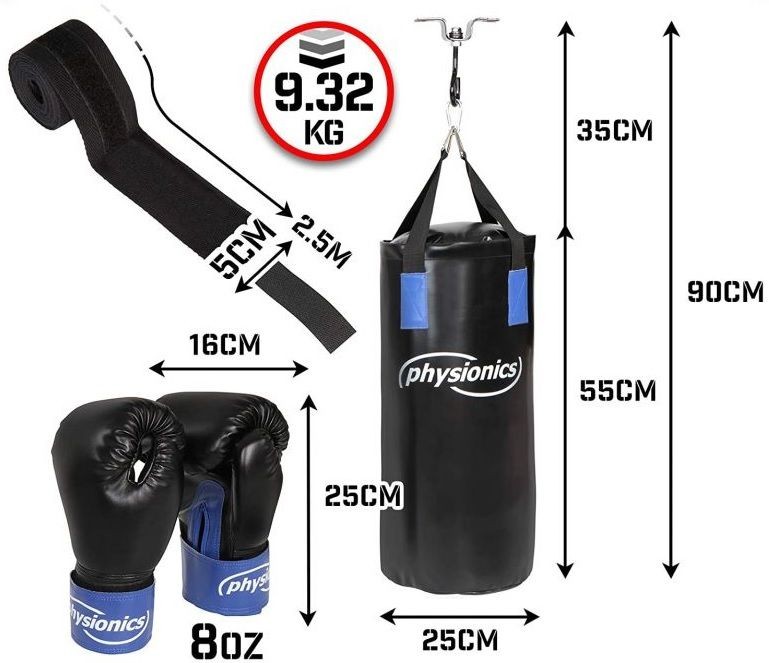 Tato boxovací sada obsahuje vše, co potřebujete k trénování techniky, vytrvalosti a síly je vhodné pro děti a mládež. Ochranné pásky se suchým zipem a poutky na palce zajišťují větší bezpečnost při tréninku. Velmi stabilní montáž do stropu s otočným hákem, boxovací pytel se může volně houpat, aniž by se zamotal. Boxovací pytel je držen ve 4 bodech tkaninovými popruhy odolnými proti roztržení, šitými křížovými švy.
