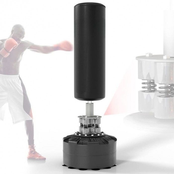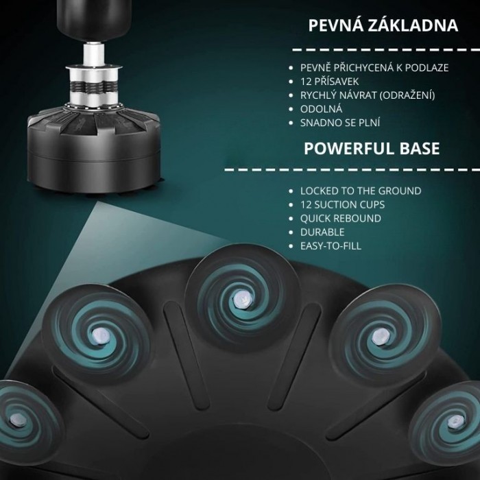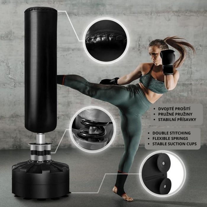 Masivní základna s 12 přísavkami a možností naplnění vodou či pískem zaručuje maximální stabilitu i při silných úderech. Pružinový mechanismus se čtyřmi ocelovými pružinami zajišťuje realistický odpor a rychlý návrat pytle do původní polohy. Boxovací pytel je ručně šitý z odolné PU kůže a nylonu, což garantuje dlouhou životnost a komfortní trénink bez nutnosti montáže na stěnu nebo strop.