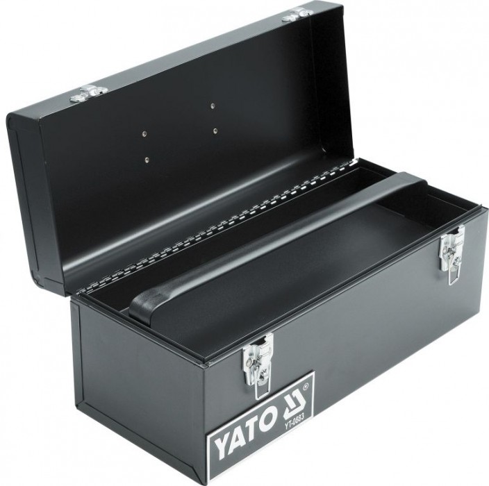 Kovový box na uložení nářadí, s madlem pro snadné přenášení. Uvnitř kufru je vložena přihrádka na drobné nářadí. Zavírání kufru je řešeno 2x kovovými sponami, které je možné uzamknout pomocí zámečků.