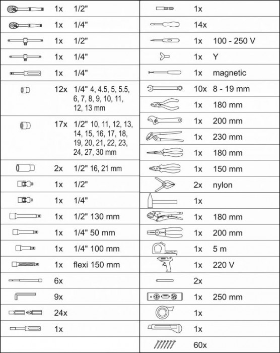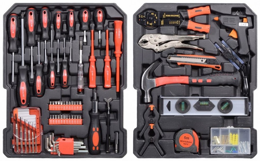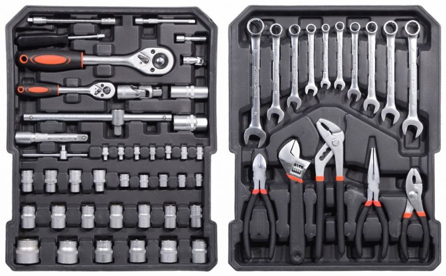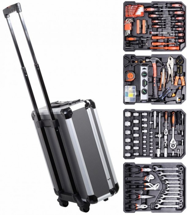 Vše uspořádané v přehledných pozicích - 4 nástrojová plata.Kufřík je vybaven teleskopickým úchytem a kolečky, díky kterým je manipulace s celou sadou nářadí velice snadná. Sada obsahuje celou řadu kleští, šroubováků, gola klíčů, kladivo, vodováhu, stranové i imbus klíče, bity, základní spojovací materiál a celou řadu dalšího nářadí, které je vhodné pro použití jak doma, v garáži, tak i na cestách.