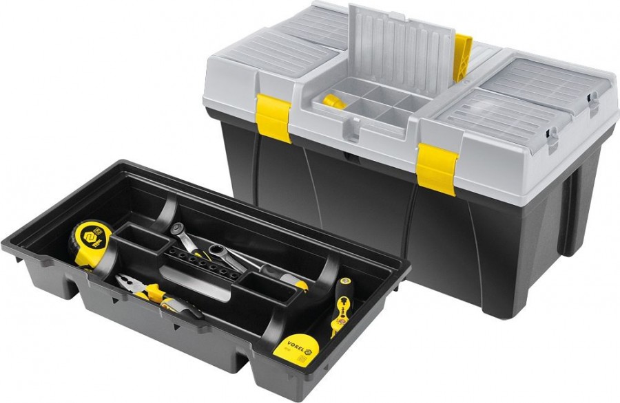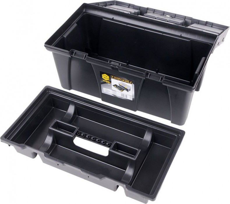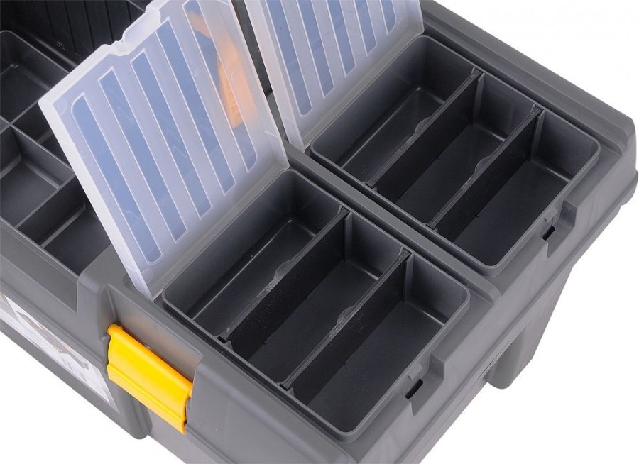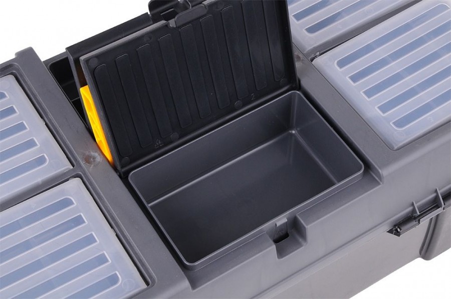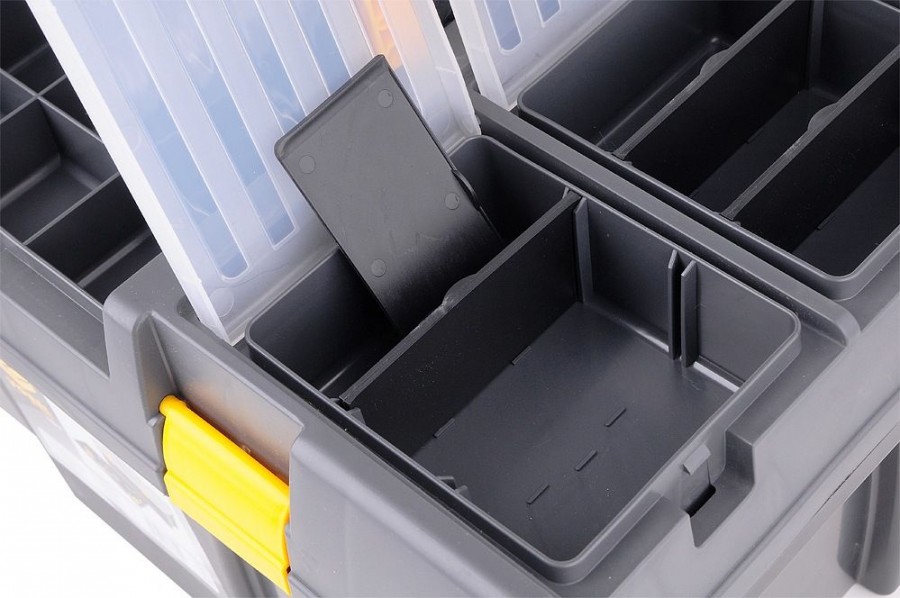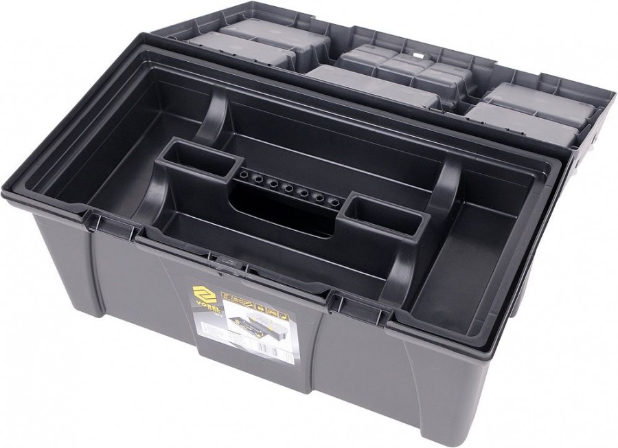Plastový kufr se dvěma vyjímatelnými organizéry na víku a vnitřní vyjímatelnou vložkou na drobné předměty.