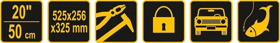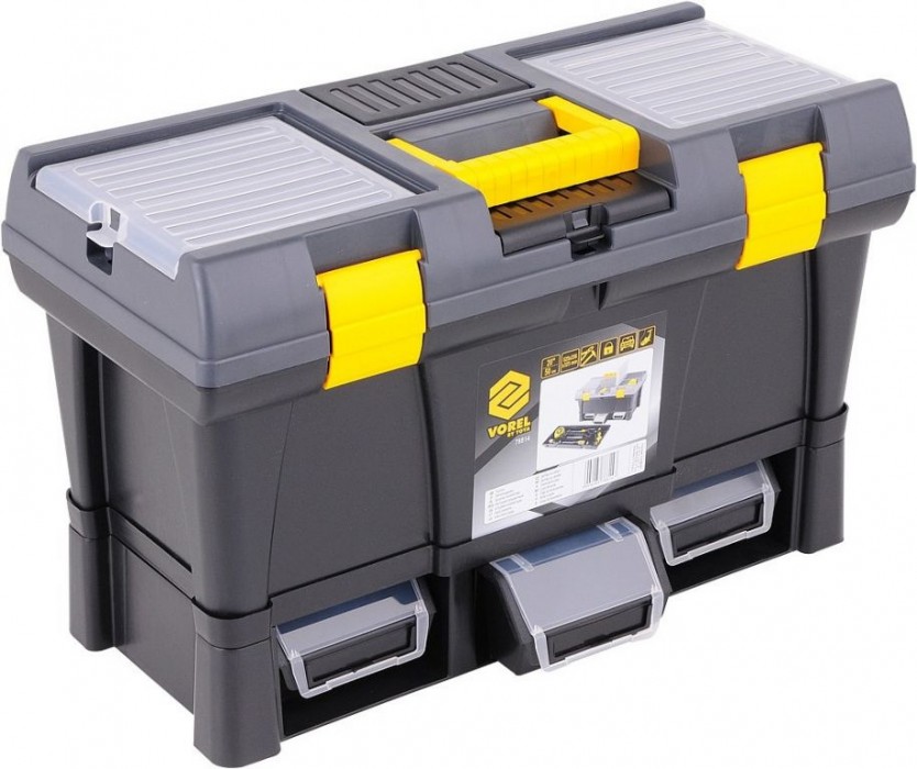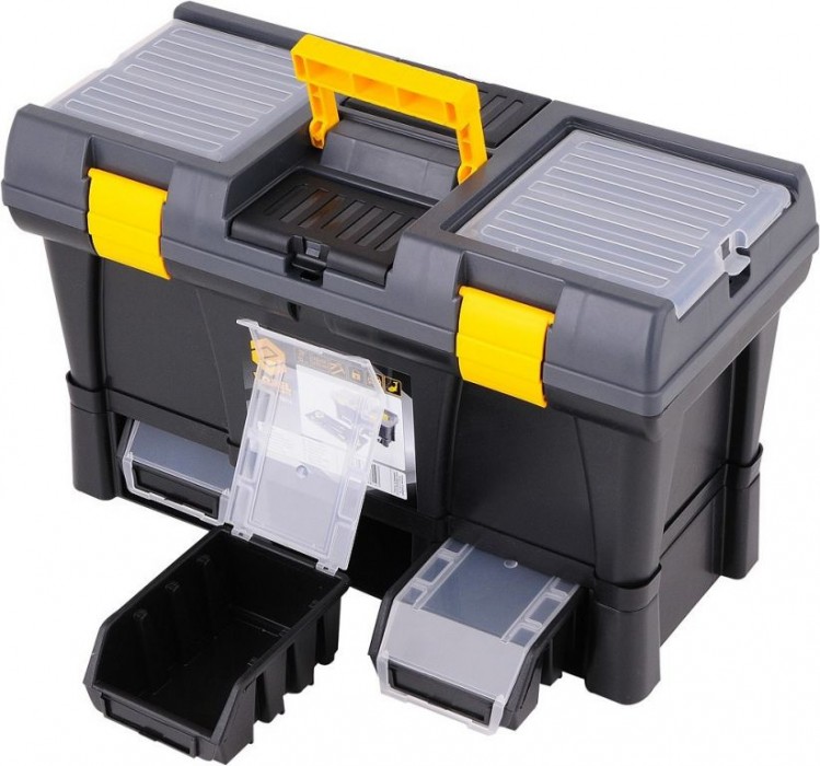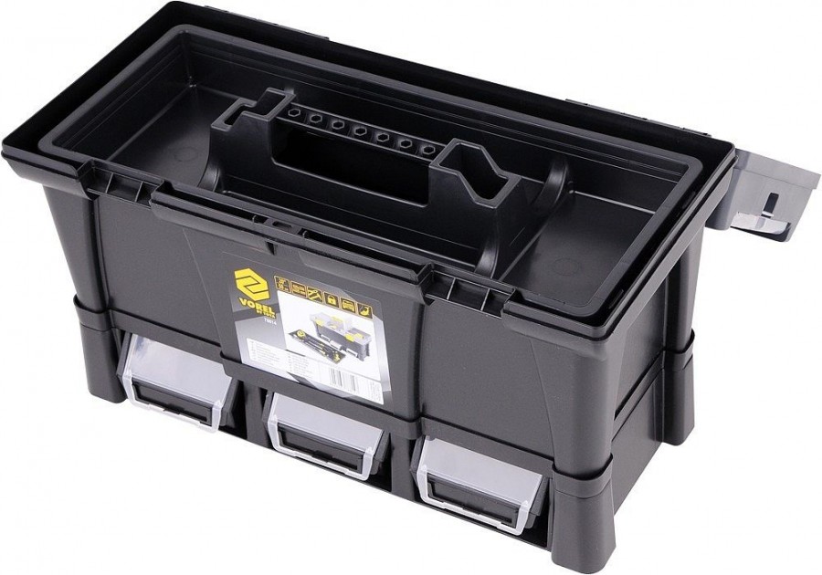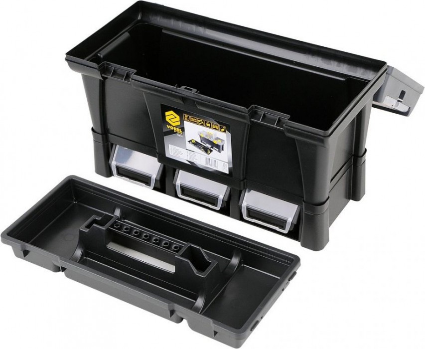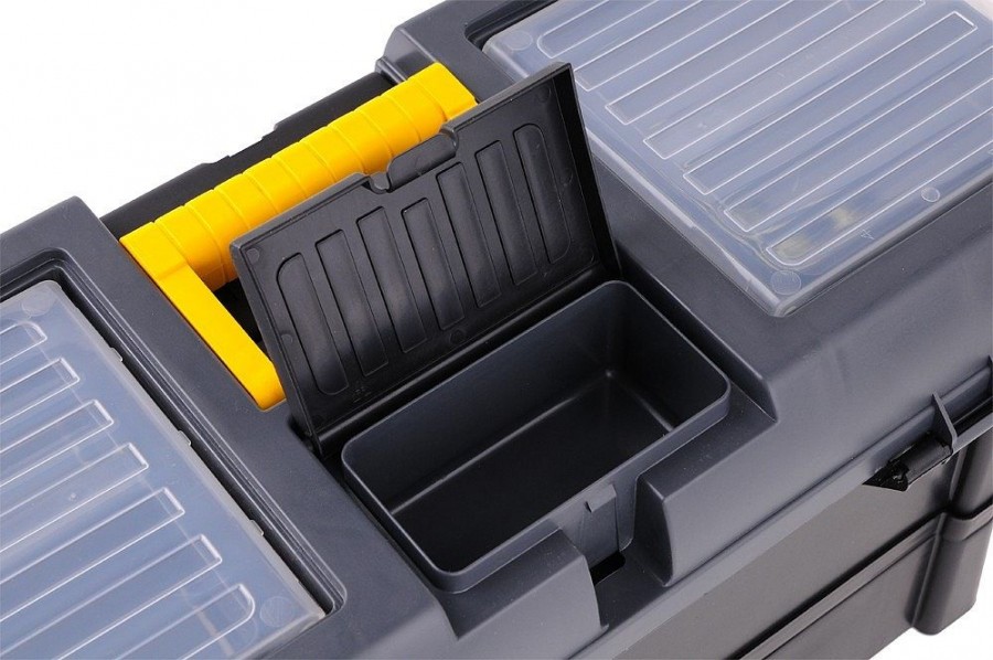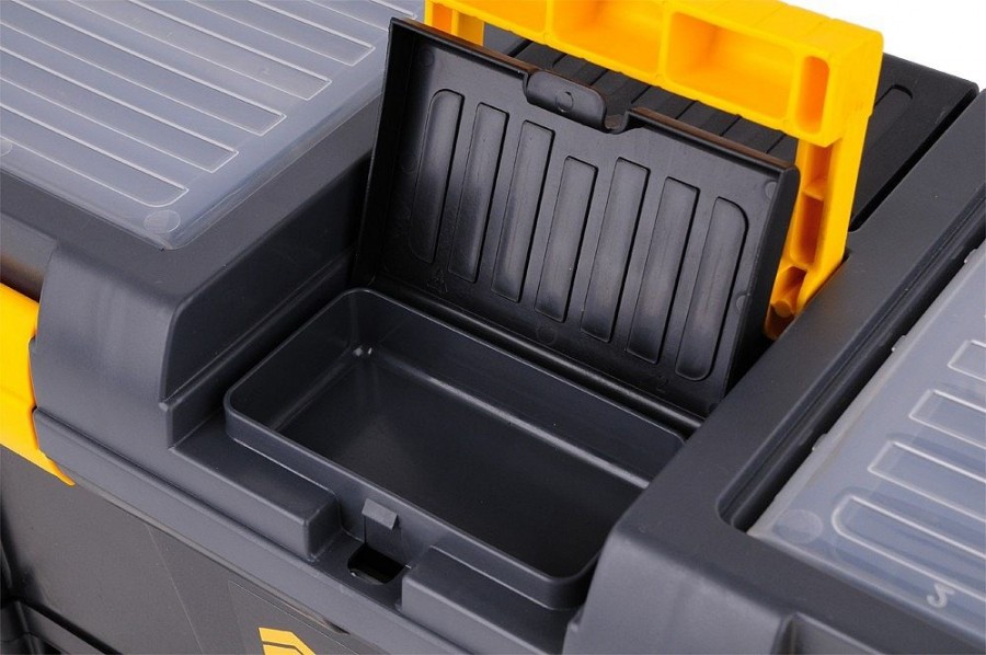 Plastová konstrukce s uzavíratelným víkem na 2 zámky a vnitřním přenosným boxem na nářadí. Dva prostorné organizéry v postranních částech víka k uskladnění šroubků, matek či jiného spojovacího materiálu. Sklopné ucho na vrchní části je dostatečně široké i pro přenos na delší vzdálenosti a při úplném naplnění boxu jej účinně vyvažuje. Na vyjímatelnou vnitřní část lze nabrat potřebné nářadí, jako jsou šroubováky, svinovací metry, vodováhy, kladiva.