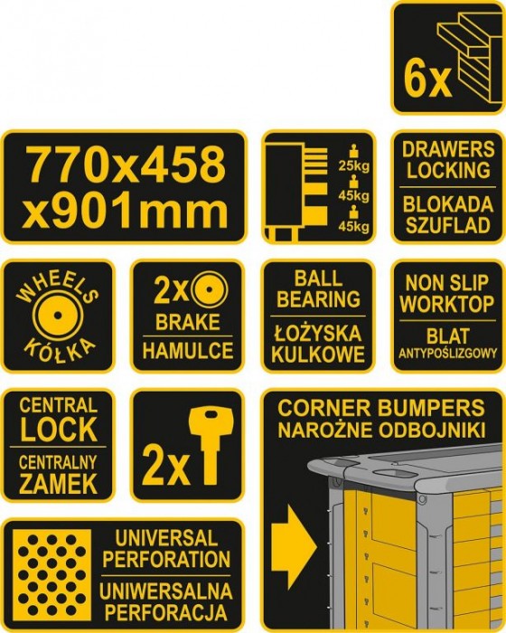 Na rozích je vybavena chrániči, takže při případné kolizi nepoškrábe např. lak karoserie vozu. Horní deska je z pevného polypropylenu. První všechny jsou pak uzamykatelné. Na bocích je možné další zavěšení příslušenství díky perforaci celé plochy. Skříňka je pojízdná, má 4 kolečka, osazena kuličkovými ložisky, z toho 2x kolečka jsou bržděná.
