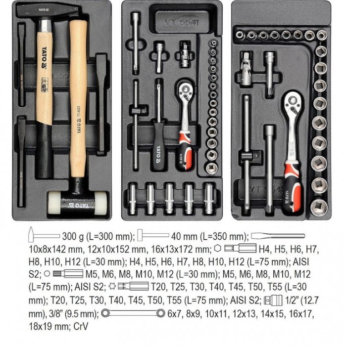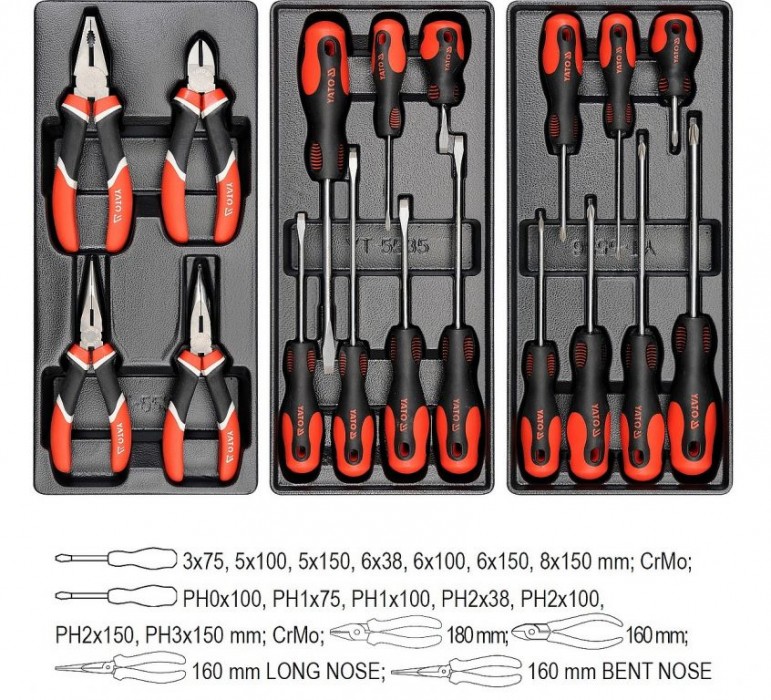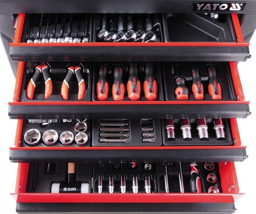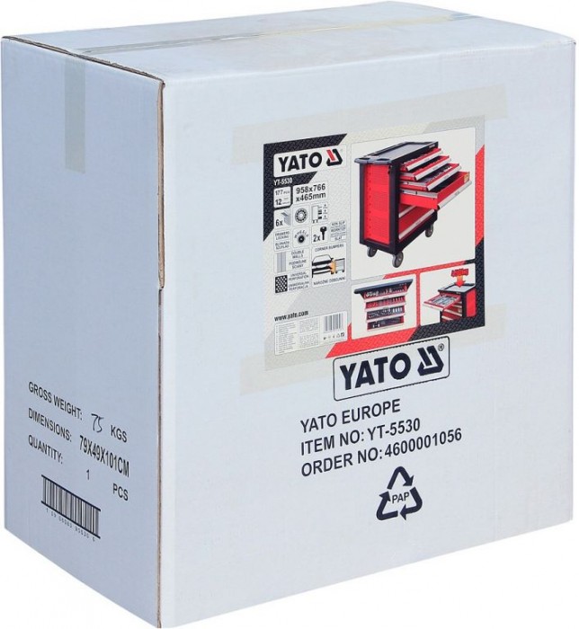 Dílenská skříňka značky YATO, vybavena 6 zásuvkami s kuličkovým ložiskem, 4 horní zásuvky obsahují pečlivě vybrané nástroje. Centrální zamykání na klíč, skříňka je vybavena protiskluzovými kolečky s brzdami a rohovými nárazníky, které chrání proti náhodnému poškození okolí (např. karoserie automobilu). Horní deska skříňky může sloužit jako stůl, je vyrobena z protiskluzového polypropylenu. Profily jsou vyrobeny z dvojité oceli - univerzální perforace umožňuje dovybavit skříňku dalšími prvky.