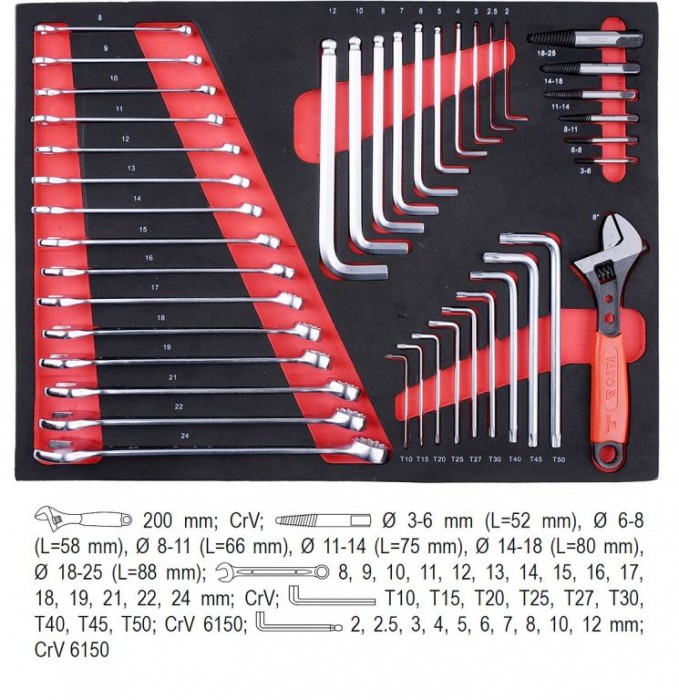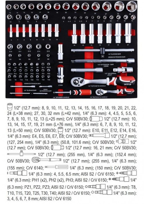 Dílenská skříňka nástrojů značky YATO, vybavena 7 zásuvkami s kuličkovým ložiskem, 5 horních zásuvek obsahuje pečlivě vybrané nástroje. Centrální zamykání na klíč, skříňka je vybavena protiskluzovými kolečky s brzdami a rohovými nárazníky, které chrání proti náhodnému poškození okolí (např. karoserie automobilu). Horní deska skříňky může sloužit jako stůl, je vyrobena z protiskluzového polypropylenu. Profily jsou vyrobeny z dvojité oceli - univerzální perforace umožňuje dovybavit skříňku dalšími prvky.