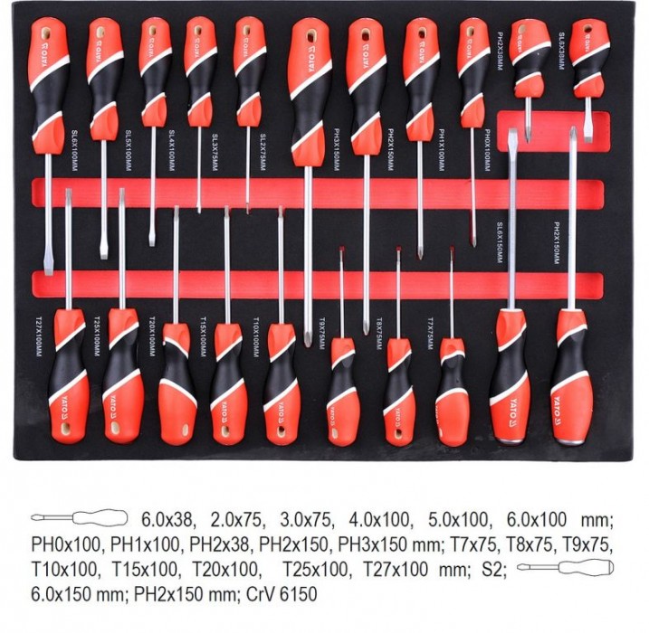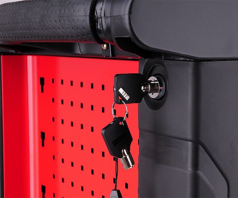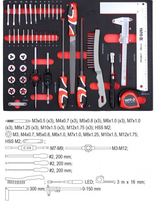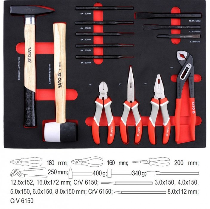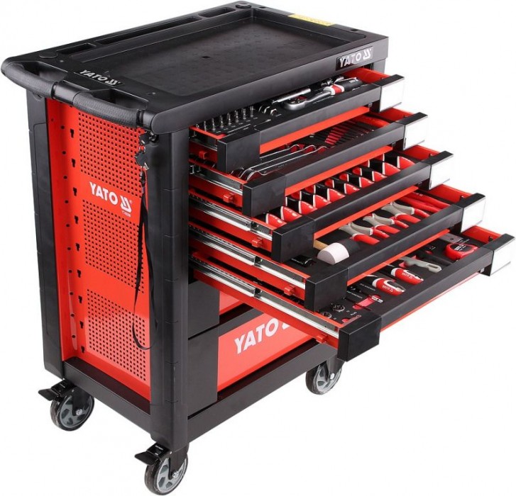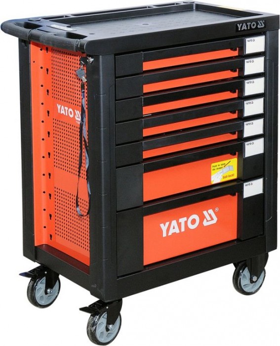 Dílenská skříňka nástrojů značky YATO, vybavena 7 zásuvkami s kuličkovým ložiskem, 5 horních zásuvek obsahuje pečlivě vybrané nástroje. Centrální zamykání na klíč, skříňka je vybavena protiskluzovými kolečky s brzdami a rohovými nárazníky, které chrání proti náhodnému poškození okolí (např. karoserie automobilu). Horní deska skříňky může sloužit jako stůl, je vyrobena z protiskluzového polypropylenu. Profily jsou vyrobeny z dvojité oceli - univerzální perforace umožňuje dovybavit skříňku dalšími prvky.