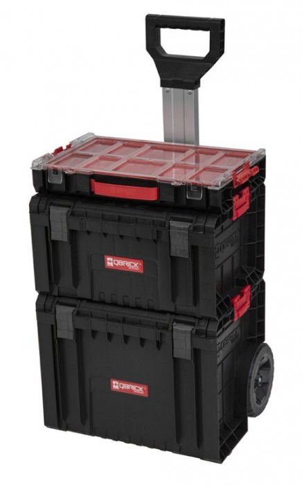 Těsnění na víku, které zajistí ochranu proti vodě a prachu. Modulární konstrukce, díky které můžete výrobek propojit s dalšími produkty QBRICK. Boční spojovací konektory. Polyamidové přední uzavírací klipy, které zajistí 100% těsnění. Zesílená konstrukce těla Set obsahuje tři různé boxy, které složíte na sebe a díky kolečkům jednoduše přemístíte. V setu najdete organizér, box na nářadí s nastavitelnými přepážkami a prostorný box na kolečkách s hliníkovou teleskopickou rukojetí.