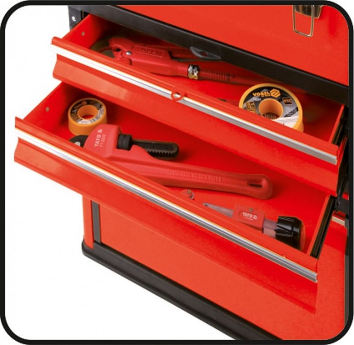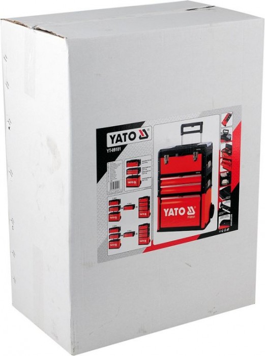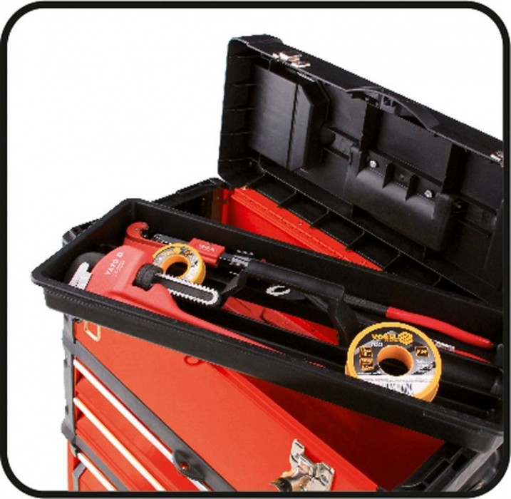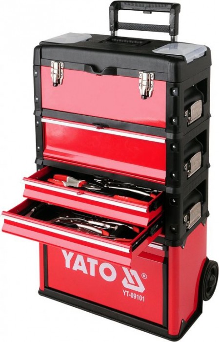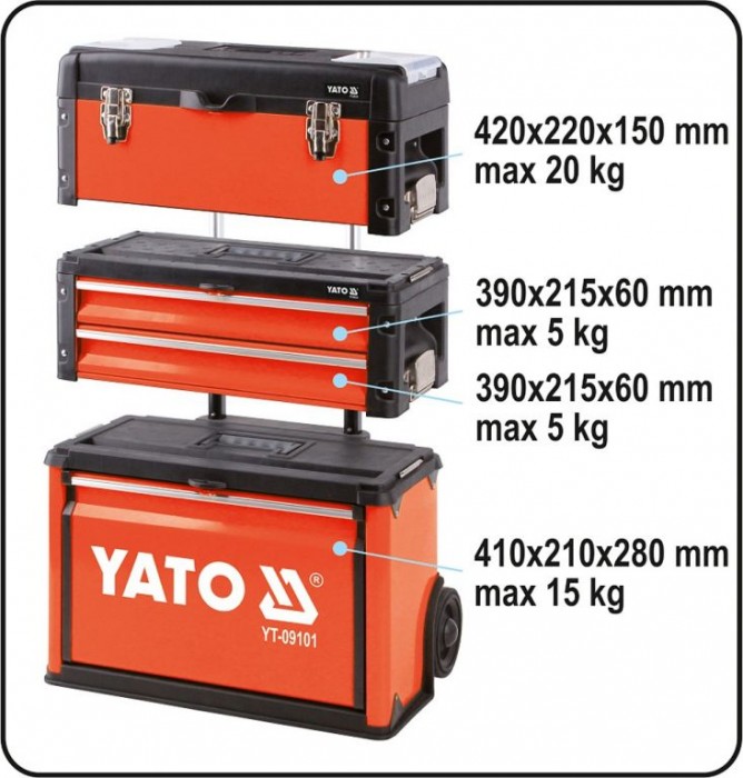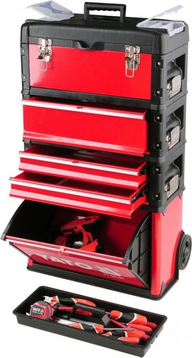 Třídílná servisní skříň s vestavěnými kolečky a teleskopickou rukojetí, pro snadné přenášení uloženého nářadí. Horní modul je uzavratelný pomocí dvou kovových spon, které je možné uzamknout pomocí zámku (není součástí). Navíc je opatřen dvěma plastovými kufříky na drobné součásti. Centrální modul má dvě kovové zásuvky. Spodní modul je velmi objemný a má vysokou nosnost.