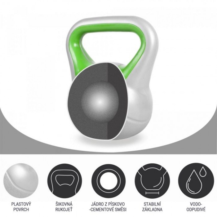 Efektivní trénink nezávisí na velkém a objemném vybavení, které se nevejde ani do vašeho obývacího pokoje. Můžete trénovat opravdu efektivně i při malém prostoru, pokud víte, jak cíleně používat své tělo. Provedení kettlebell zaujme stylovým a praktickým povrchem, který chrání nejen vaši podlahu. Kettlebell lze během tréninku použít různými způsoby. Na začátku tréninku byste se měli vždy dobře rozcvičit a začínat s lehčím kettlebellem.
