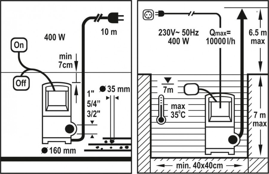 Čerpadlo se hodí pro domácnosti, zahrady, i v zemědělství. Může být použito pro rychlé odčerpávánía přepouštění vody v nádržích a nebo vypouštění zatopené místnosti. Tělo čerpadla je vyrobeno z vysoce odolného plastu, dále je vybaveno plovákovým spínačem, který zabraňuje provozu čerpadla "na sucho". Pro připojení do sítě, je čerpadlo opatřeno kabelem délky 10 m.