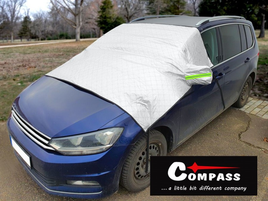 Upevnění je řešeno pomocí popruhů s háčky a umístěním uší přes zrcátka automobilu. Plachta díky svým rozměrům zakrývá celé čelní sklo včetně stěračů a navíc chrání i zrcátka vozu.