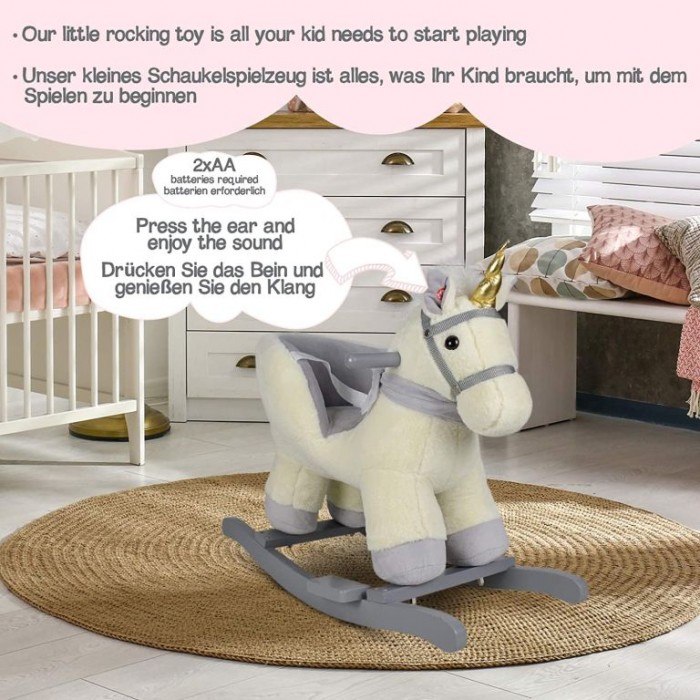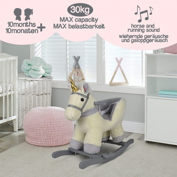 Naše malá houpací hračka může být dokonalým společníkem pro V aše dítě, které miluje zvířata a jeho cestou do světa kreativní hry a fantazie. Houpací kůň je vybaven nastavitelným bezpečnostním pásem a má dvě praktická držadla, která udržují rovnováhu, a opěrky nohou, které zajišťují stabilitu. Třístranný útulný prostor k sezení a navíc hudební funkce - vaše dítě nepotřebuje víc, aby si mohlo začít hrát. Upozornění: Nevhodné pro děti do 10 měsíců. Používejte pouze pod přímým dohledem dospělých.