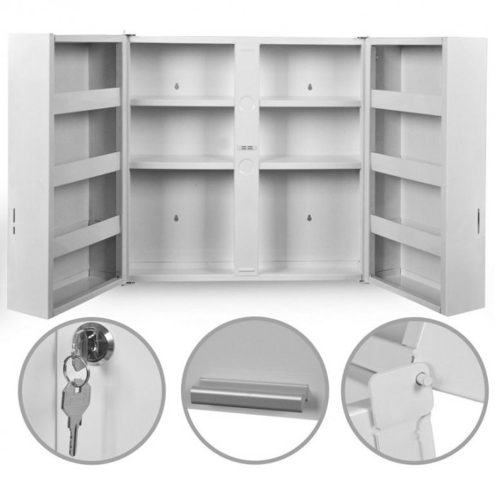 S touto lékárničkou s 11 přihrádkami z oceli můžete umístit všechny výrobky související s první pomocí bezpečně a uzamknout díky zámku dveří. Tím se zabrání manipulaci s obsahem bez klíče. Tento aspekt je obzvláště důležitý pro bezpečnost dětí v domácnosti, protože poskytuje záruku, že nedojde k nečekaným událostem. Tuto skříňku lze navíc umístit v požadované výšce v koupelně, na chodbě nebo v jiné místnosti, protože montáž na zeď je velmi snadná.