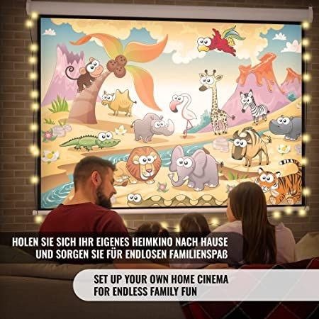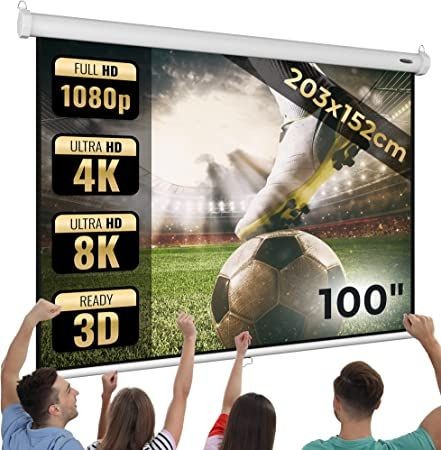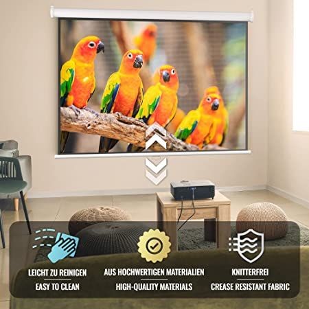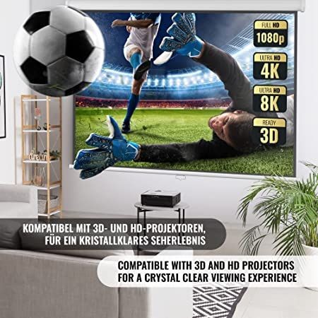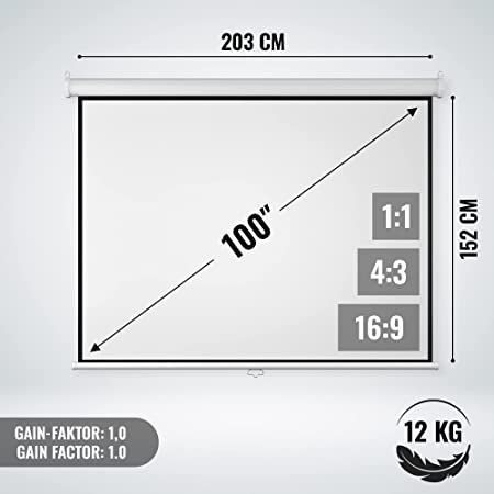 Pro větší odolnost je třívrstvá tkanina potažena vinylem. Díky tomu lze projekční plátno snadno otřít a snadno udržovat. Samonavíjecí plátno je vybavena plnou 3D a HD funkcí. Úhlopříčka obrazovky měří přibližně 100 palců nebo 254 centimetrů. Formáty jako 1:1, 4:3, 16:9 a další lze rychle a plynule nastavit ručně. S těmito předpoklady už nic nestojí v cestě požitku z domácího kina. Černé maskování okrajů po stranách a černá zadní strana obrazovky zajišťují optimální kontrastní poměry. Díky váhové tyči nedochází k nepěkným záhybům.