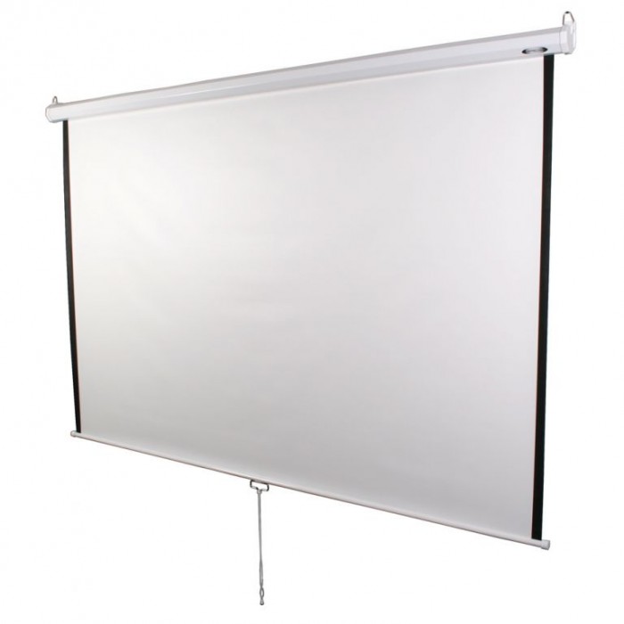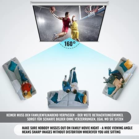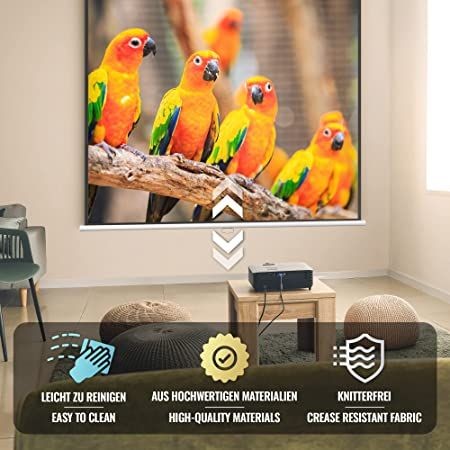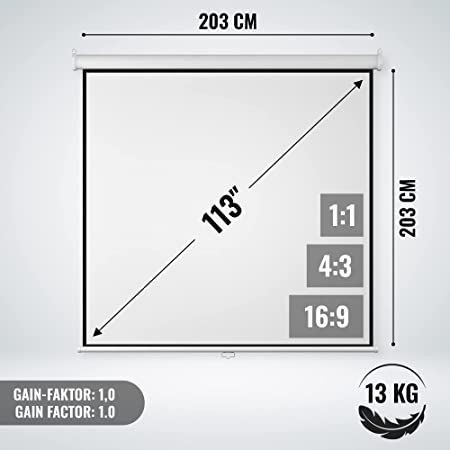 Úhlopříčka obrazovky měří přibližně 113 palců, tedy přibližně 289 centimetrů. Můžete snadno nastavit formáty, jako je 1:1, 4:3, 16:9 a mnoho dalších. Obrazovka má koeficient zesílení 1,0, který je optimalizován pro projekce s LCD a DLP paprsky. Zde jste vždy flexibilní, stejně jako při montáži na stěnu nebo na strop. Projekční plátno je vyrobeno z třívrstvé tkaniny, která se díky vinylovému potahu snadno čistí vlhkým hadříkem. Po použití lze obrazovku opět srolovat a díky technologii rolování zůstává bez záhybů.
