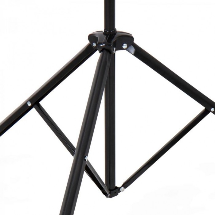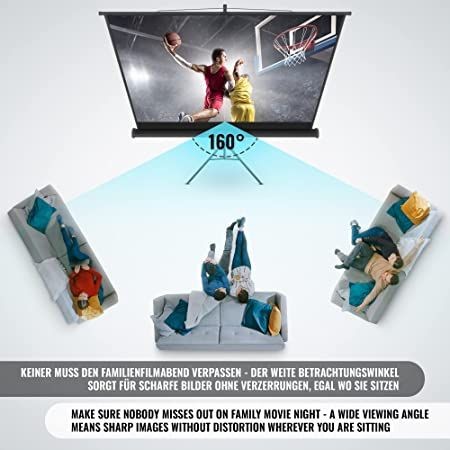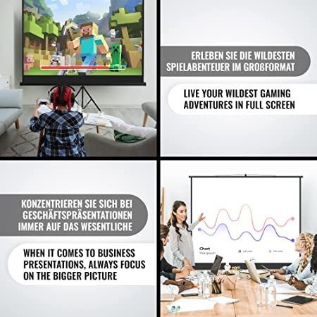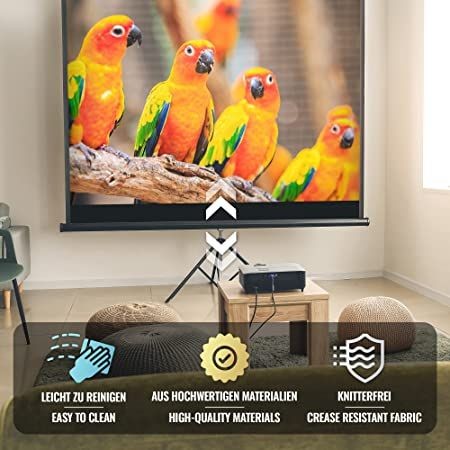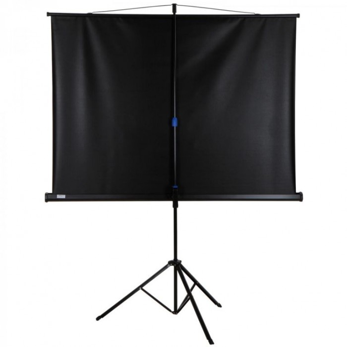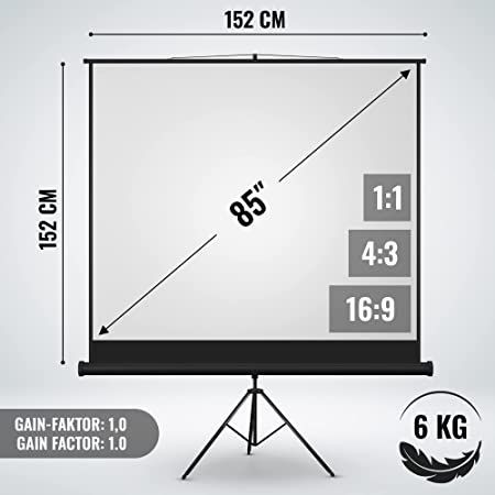 Rolovací plátno má úhlopříčku přibližně 85 palců, což odpovídá přibližně 215 centimetrům. Robustní kovový stojan s plastovými nožičkami zajišťuje stabilitu a odolnost proti uklouznutí. Nepříjemným záhybům zabrání zátěžová tyč. Třívrstvá tkanina se díky vinylovému potahu snadno čistí.