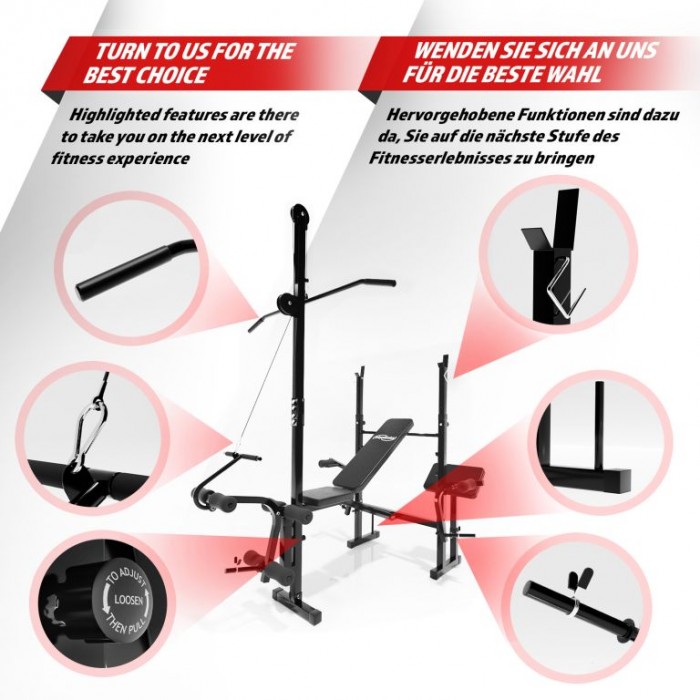 Díky této posilovací lavici můžete trénovat profesionálně i doma. Tato posilovací lavice je ideální pro cílený trénink jednotlivých svalů nebo svalových skupin. Různé možnosti tréninku hrudníku, břicha, paží a ramenních svalů vás dovedou k úspěchu a sníží stres. Multifunkční posilovací stanice je vhodná pro začátečníky i pokročilé uživatele.