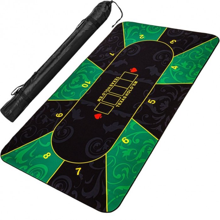 Pokerová podložka je vhodná až pro 10 hráčů. Přední strana je vyrobena z vodoodpudivého polyamidu aj materiál je příjemně měkký a hladký na dotek (podobně jako podložka pod myš). Zadní strana je vyrobena z protiskluzového přírodního kaučuku - gumový povlak zabraňuje sklouznutí podložky. Podložku lze srolovat, aby se ušetřilo místo, a lze ji snadno vzít kamkoliv pomocí přiložené brašny.