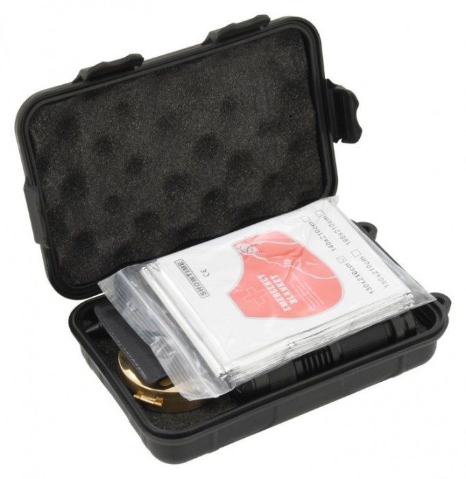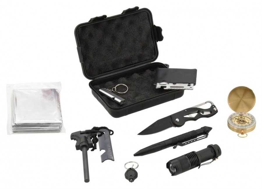 SOS sada je složena ze zavíracího nože s čepelí délky 6,5 cm, multifunkční karty, píšťalky, kompasu s otočnou stupnicí, bivakovací (izotermické) fólie, rozměrného křesadla pro zapálení ohně, přívěškem s LED osvětlením, celokovovým perem s průrazným hrotem a LED svítilnou napájenou AA baterií (není součástí balení) s nastavitelným kuželem vysoce výkonného světla. Vše je uloženo v ochranném, uzavíratelném pouzdře.