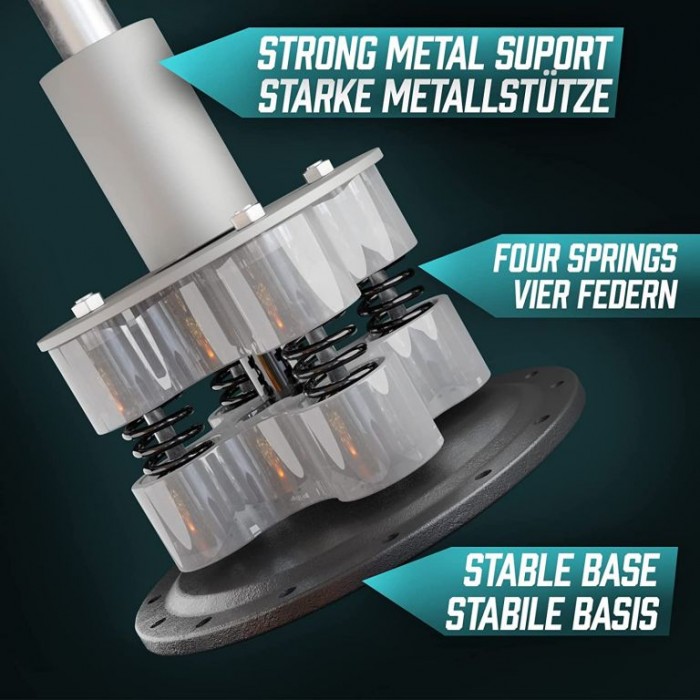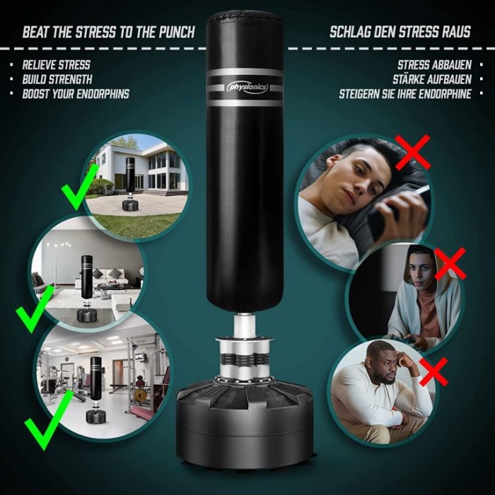 Volně stojící boxovací pytel není určen pouze pro boxery, ale je skvělým fitness vybavením pro všechny sportovce a sportovní fanoušky, ať už jsou zběhlí v bojových uměních, nebo se jen chtějí uvolnit po dlouhém dni v kanceláři. S pevnou, stabilní základnou a spolehlivým pružinovým mechanismem je tento boxovací pytel se stojanem ideálním řešením, pokud není možná montáž na stěnu nebo strop. Má silnou přísavnou základnu s 12 přísavkami pro upevnění.