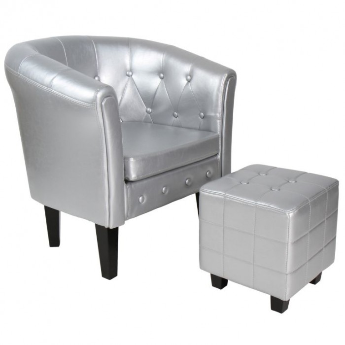 Klubové křeslo s taburetem Chesterfield, stříbrné