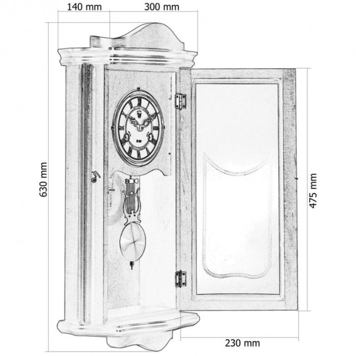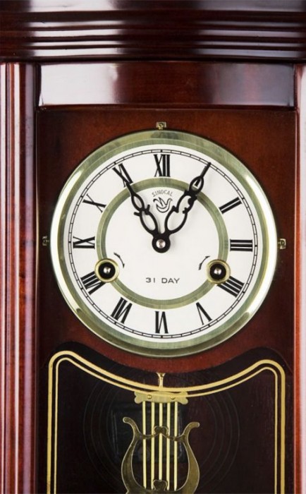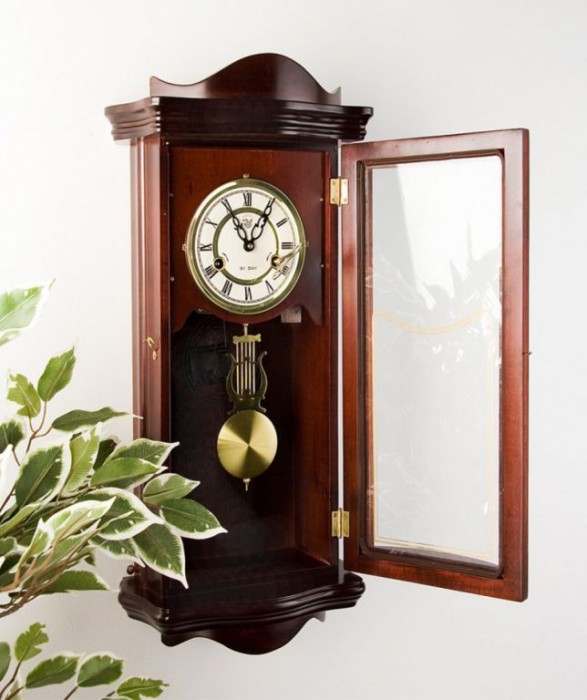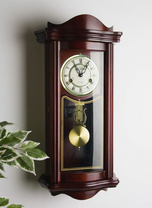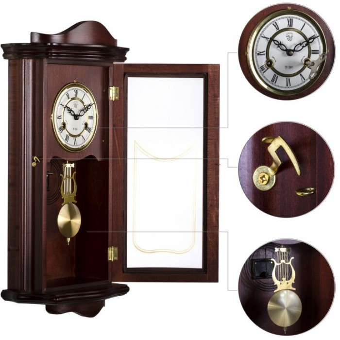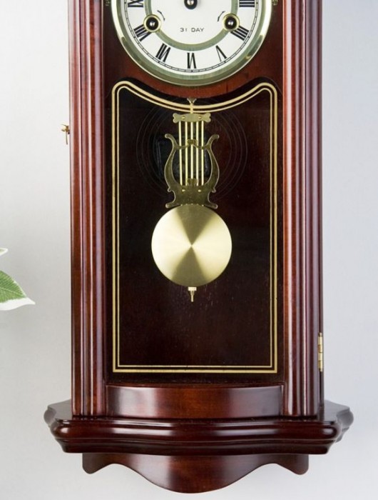 Kyvadlové nástěnné hodiny v tradičním stylu imitujícím mahagon vhodné jako retro bytový doplněk. Má 31 denní cyklus s odbíjecím mechanismem v polovinu a celou hodinu. Oproti většině kyvadlových hodin, které se musejí natahovat častěji, tyto hodiny stačí natáhnout jedenkrát za 31 dní. Na číselníku jsou dva otvory, přes které se za pomocí klíče hodiny natahují. U levého otvoru se jedná o bicí tón u pravého se jedná o čas. Pokud nebudete chtít, aby hodiny odbíjely, tak můžete natáhnout pouze pravý otvor. Nejsou potřeba žádné baterie ani elektřina, protože jsou plně mechanické.