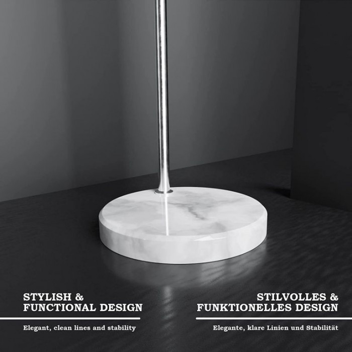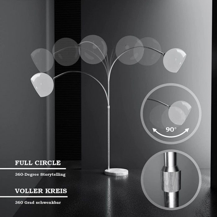 Tato bílá oblouková lampa s mramorovým podstavcem dodá vašemu obývacímu pokoji, ložnici nebo kanceláři nádech jednoduchosti a elegance. Tato stojací lampa je výškově nastavitelná (130 - 180 cm) a vyžaduje standardní žárovku nebo LED žárovku E27 (žárovka není součástí dodávky); max. 60 W/8W. Stínidlo naší stojací lampy lze otáčet, takže můžete osvětlit libovolnou oblast. působ, jakým je žárovka zapouzdřena do miskovitého stínidla, dodává obloukové lampě obzvlášť příjemný, teplý a uklidňující účinek.