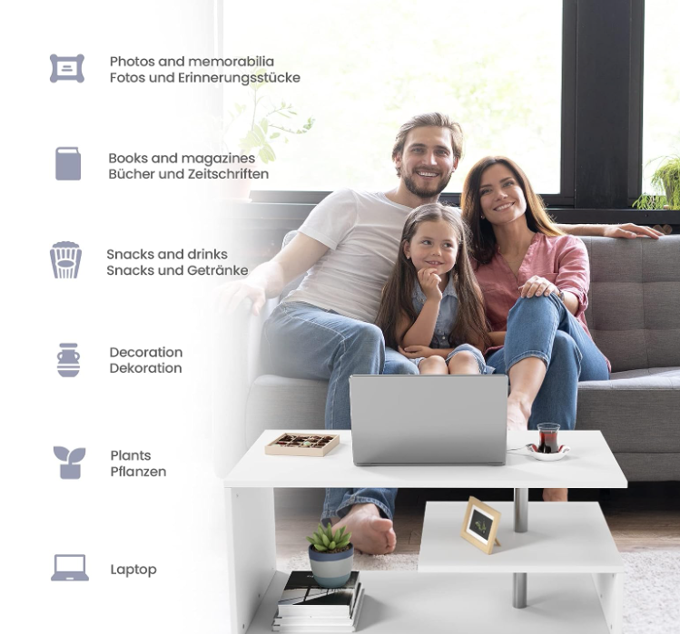 Konferenční stolek patří jednoduše do každého obytného prostředí. Důležité při hledání ideálního doplňku pro Váš domov je, že se nedíváte jen na design. Náš asymetrický konferenční stolek přináší svěží vítr do vašeho obývacího pokoje a současně nabízí úložný prostor a moderní nádech. Může být dekorován zcela podle vašeho vkusu, hodí se ale také perfektně jako odkládací plocha na nápoje a občerstvení, když se někdy setkáte s rodinou na deskovém večeru. Uchovávejte vše, co denně používáte, vždy v dosahu – tento stylový a funkční stůl tak správně oživí váš obývací pokoj. K dostání ve více barvách. Včetně podrobného návodu k montáži. Upozornění: Barvy se mohou mírně lišit od vyobrazení. Dekorace na zobrazených obrázcích není součástí dodávky.