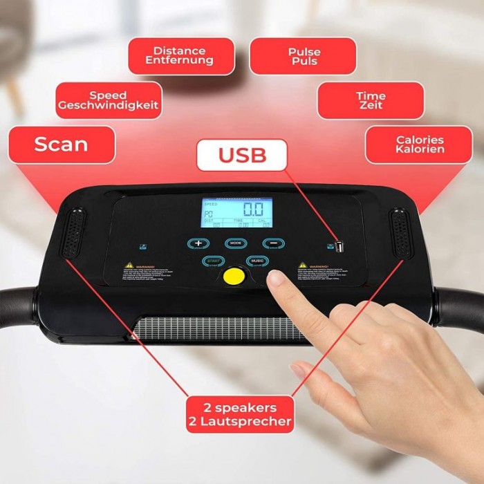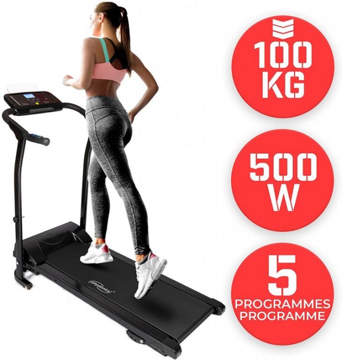 S naším běžeckým pásem si můžete nastavit vlastní tempo cvičení v pohodlí domova. S 500W motorem a rychlostí až 10 km/h je tento běžecký pás více než dostačující k udržení vaší kondice. Díky snadno ovladatelné LED obrazovce, držáku na tablet a dokonce dvěma vestavěným reproduktorům bude vaše cvičení nejen efektivní, ale také příjemné. Náš běžecký pás je ideální pro ty, kteří s fitness tréninkem teprve začínají, i pro ty, kteří již cvičí. Pomocí LED displeje můžete sledovat spálené kalorie, dobu běhu, uběhnutou vzdálenost, aktuální rychlost a tepovou frekvenci. Celkové rozměry posilovacího stroje (120 x 61 x 112 cm) a běžecké plochy (100 x 35,5 cm) jsou ideální pro malou domácnost. Připevněte bezpečnostní klíč k oděvu, aby se trenažer zastavil v případě ztráty rovnováhy a uklouznutí. Trenažer má 4 úrovně sklonu a 5 programů pro nastavení Vašeho tréninku.