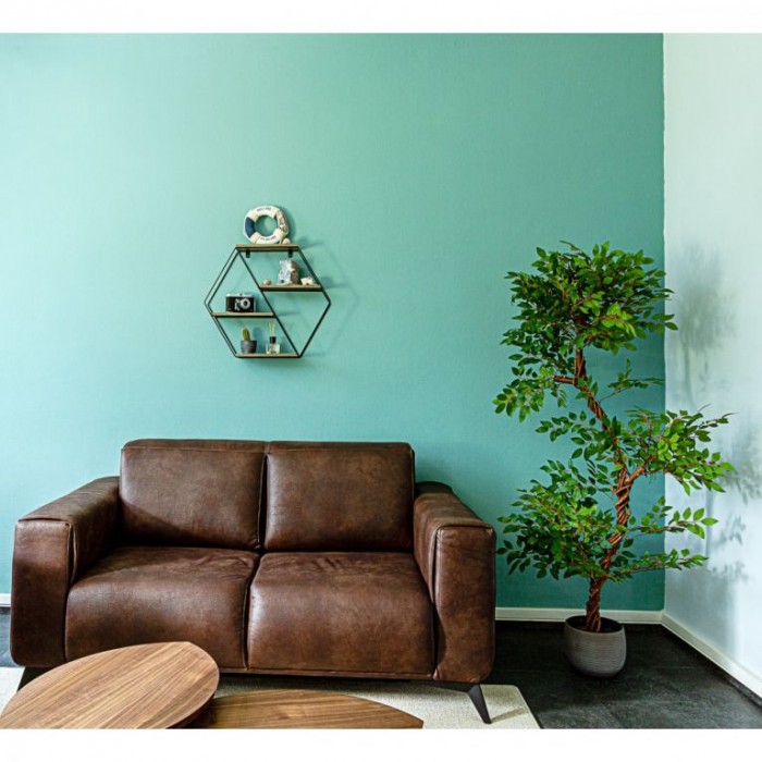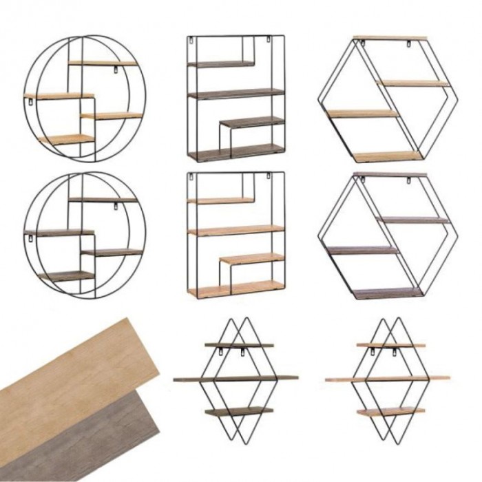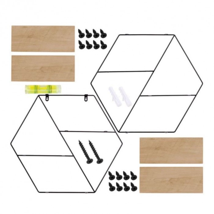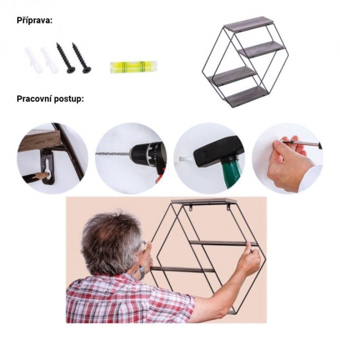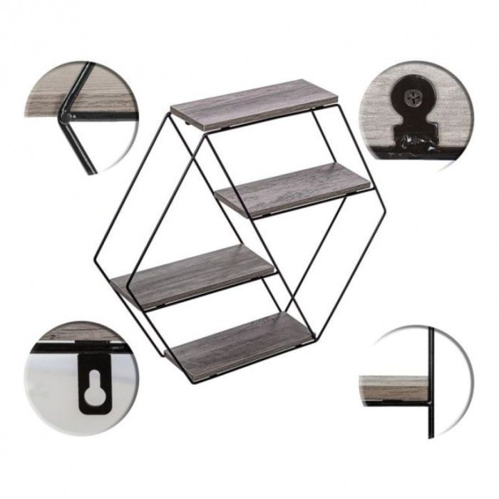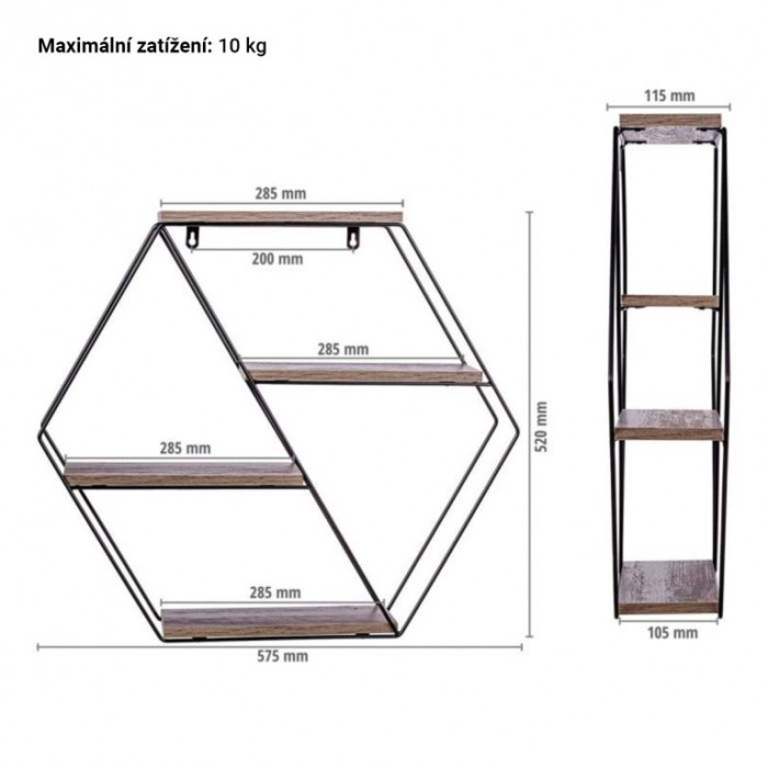 Nástěnná designová polička „hexagon" je testovaná dřevovláknitá deska MDF podle standardní dýhy E1. Kompletní police je testovaná na škodlivé látky. Díky jednoduchému rámu lze závěsnou polici dokonale kombinovat s dalším nábytkem.