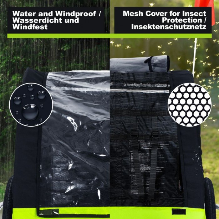 Odolnost: Trubkový ocelový rám a robustní tkanina Oxford činí tento dětský přívěs za kolo odolný vůči každodennímu opotřebení, zatímco PVC kryt udržuje cestující v dešti v suchu.
