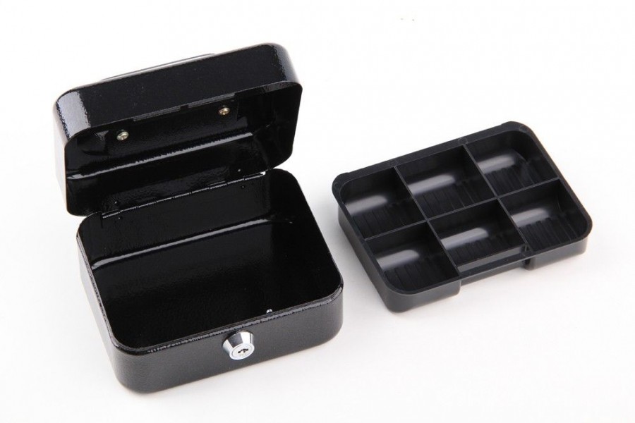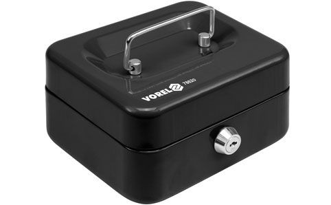 Přenosná pokladna o rozměrech 150x120x80mm. Vyrobeno z ocelového plechu o tloušťce 0,7 mm, černě natřeno. Zamykání na klíč. Sada obsahuje 2 klíče. Odnímatelná plastová vložka na mince uvnitř.
