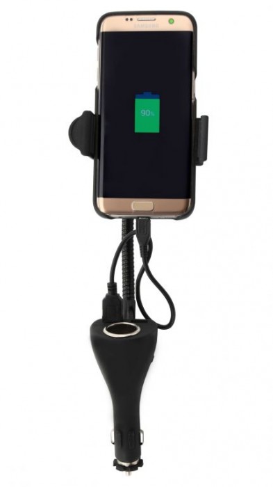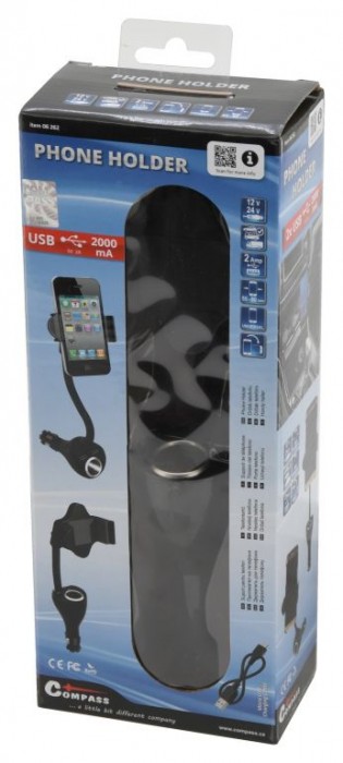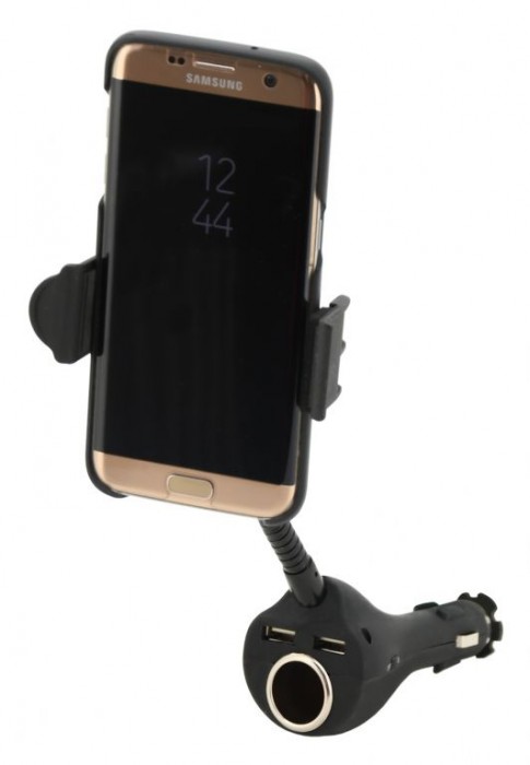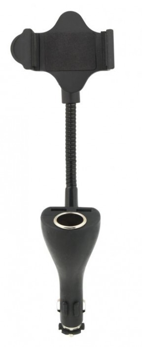 Držák telefonu do autozásuvky. Držák je možné plně přizpůsobit potřebám, díky kloubu zajišťujícímu libovolné natočení a hlavně pomocí pružného, plně ohebného těla. Držák je vhodný k uchycení telefonu. Přeztože se držák umisťuje do zásuvky zapalovače 12/24V, zásuvka zůstane díky důmyslné konstrukci zachována a navíc přibude 2x USB konektor 2 A.