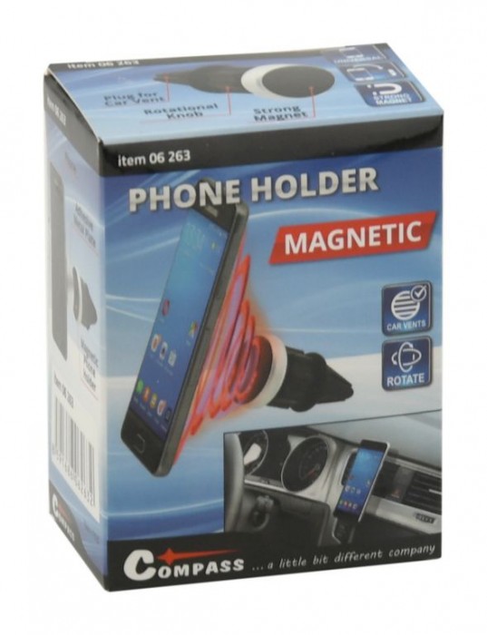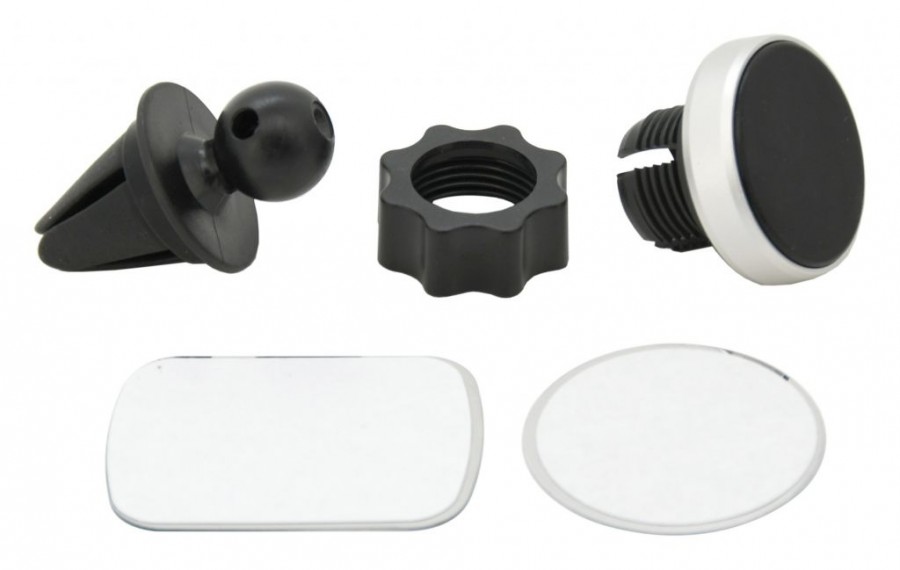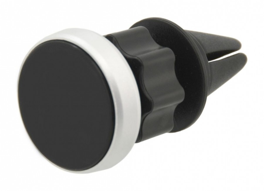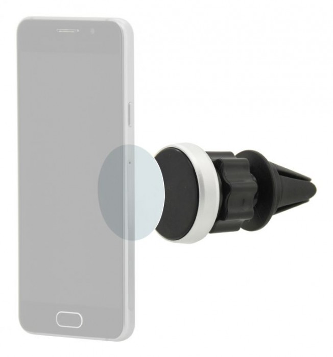Univerzální, magnetický držák telefonu do mřížky ventilace automobilu. Tělo držáku je opatřeno kloubem s aretačním prstencem, díky kterému je možné držákem otáčet a nastavit tak jednoduše libovolný úhel. K držáku jsou přiloženy magnetické samolepky, které se umístí na zadní část telefonu, pro zajištění okamžitého uchycení k držáku.