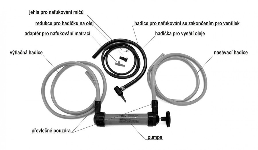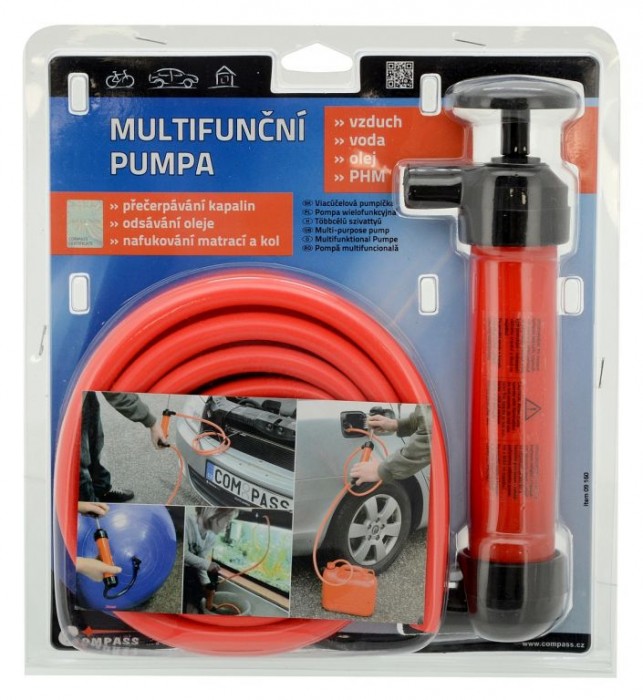 Multifunkční pumpa vhodná jak k nafukování, tak i k přečerpávání kapalin. Pumpička se dá využít při několika různých činnostech, díky přiloženým adaptérům. Je snadné nahustit matraci, bazén, jízdní kolo, či fotbalový míč,. nebo je možné pumpu použít pro přečerpání kapaliny - ať již k vyčerpání vody z akvária, tak i k přečerpání nafty, ale dokonce i k odsátí oleje z motoru.