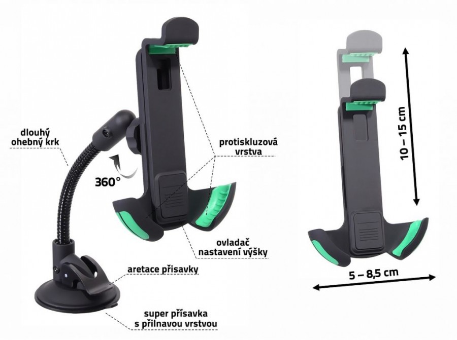 Držák telefonu s extra silnou přísavkou a ohebným ramenem, pro uchycení telefonu či navigace (až do 15 cm). Telefon v klipsu pevně drží a proti pohybu je zajištěn pomocí protiskluzové vrstvy na vnitřních stranách.