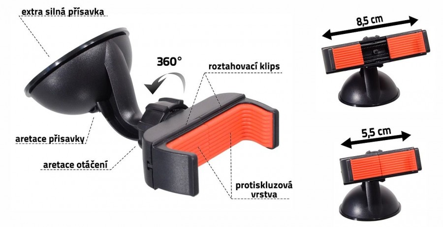 Držák telefonu s extra silnou přísavkou a klipsem pro uchycení telefonu šířky 5,5 – 8,5 cm. Telefon v klipsu pevně drží pomocí silné pružiny, a proti pohybu je zajištěn pomocí protiskluzové vrstvy uvnitř klipsu.