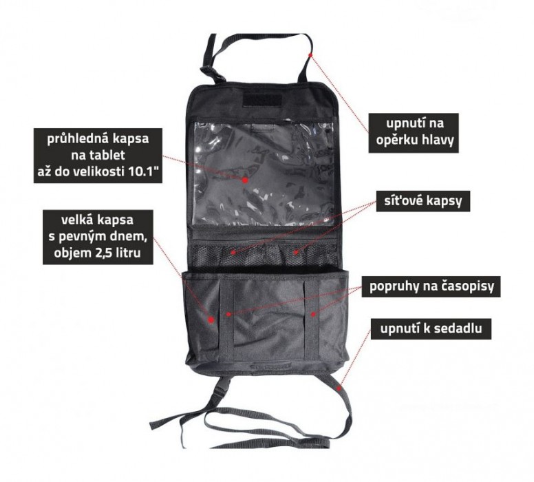 - uchycení organizéru popruhy za opěrku a sedadlo