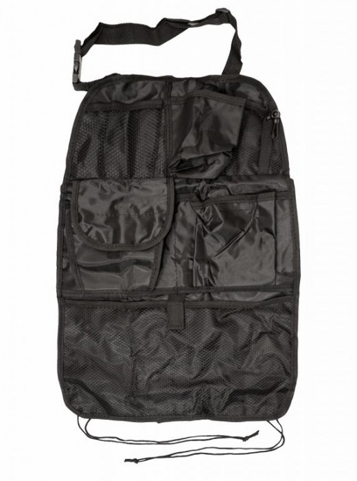 Organizér určený k připevnění na zadní stranu předního sedadla. Upevnění horní části pomocí popruhů za opěrku hlavy, spodní části popruhy za sedadlo. Jedinečné uspořádání - několik různých kapes vhodných pro mapy, nápoje a různé drobnosti.