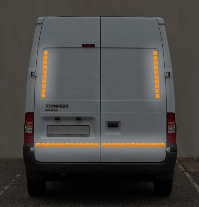 Samolepící reflexní pruh šířky 5 cm, dělený na čtverce 5 x 5 cm. Díky dělení na čtverce 5 x 5 cm vhodné na plachty, cisterny atd.