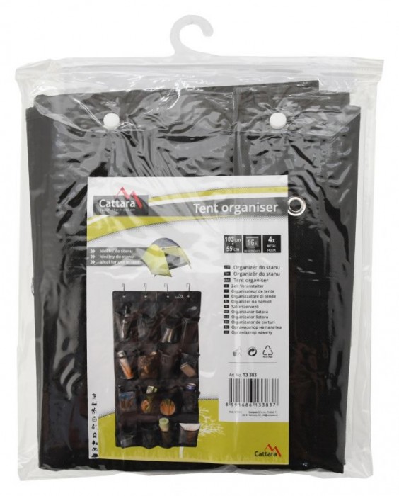 Tento organizér je opatřen sítěnými kapsami, do kterých je možné uložit nejrůznější předměty od lahví s pitím až po čelovky, peněženky, náhradní ponožky a jakékoliv další předměty. Výrobek lze snadno přenášet, protože lze jednoduše složit - přepravní rozměry výrazně usnadňují jeho transport. Pro snadné zavěšení za jakoukoliv hranu, tyčku stanu apod. jsou součástí balení kovové háčky.